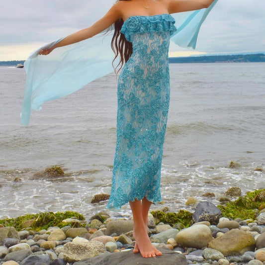 Siren Pastel Princess Baby Blue/Pink Lace Ruffled Mermaid Midi Dress