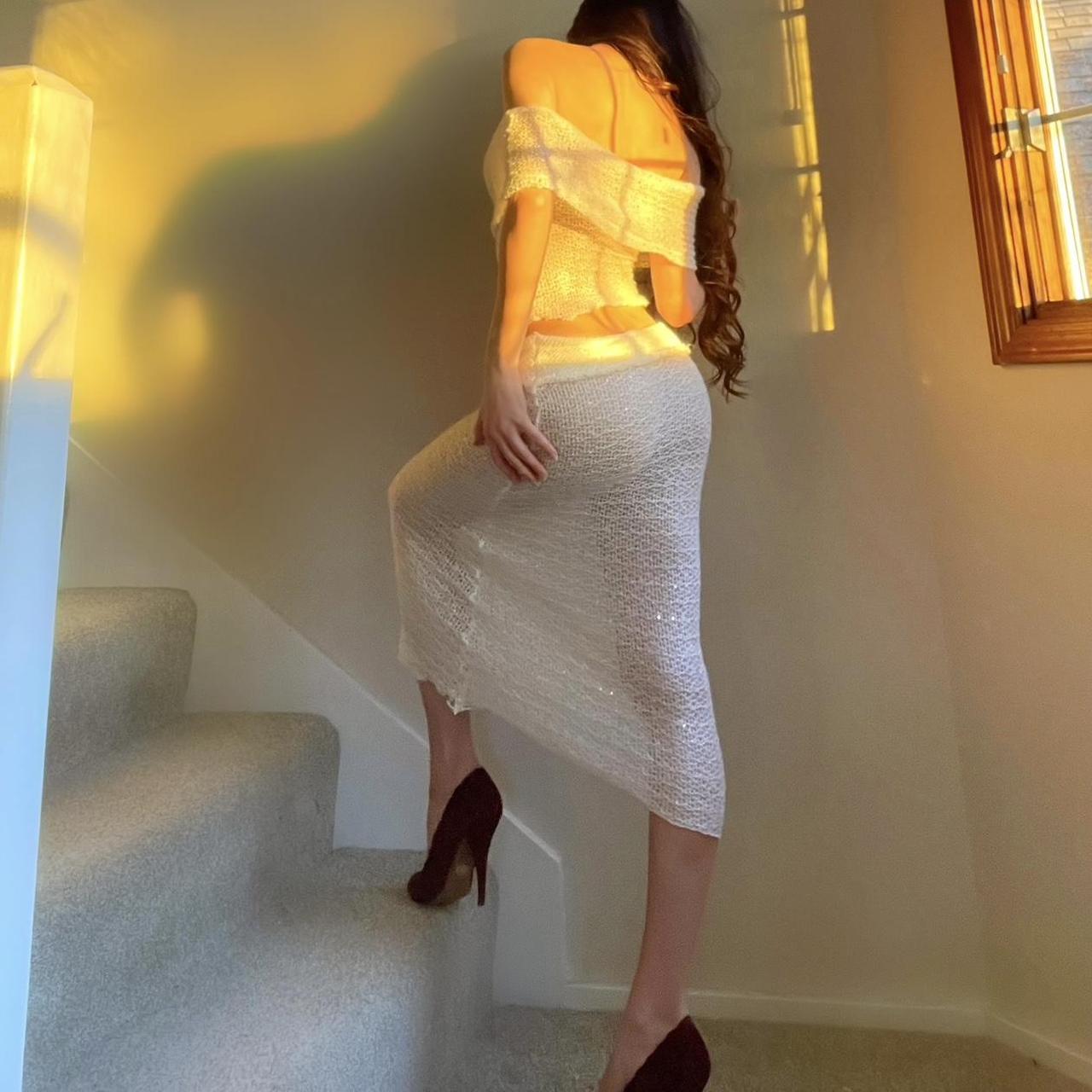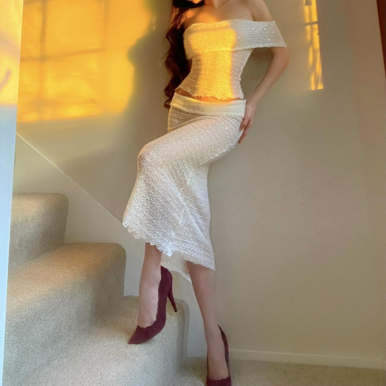 - Super flattering fit! Comes with an off the shoulder top and a low rise midi skirt.