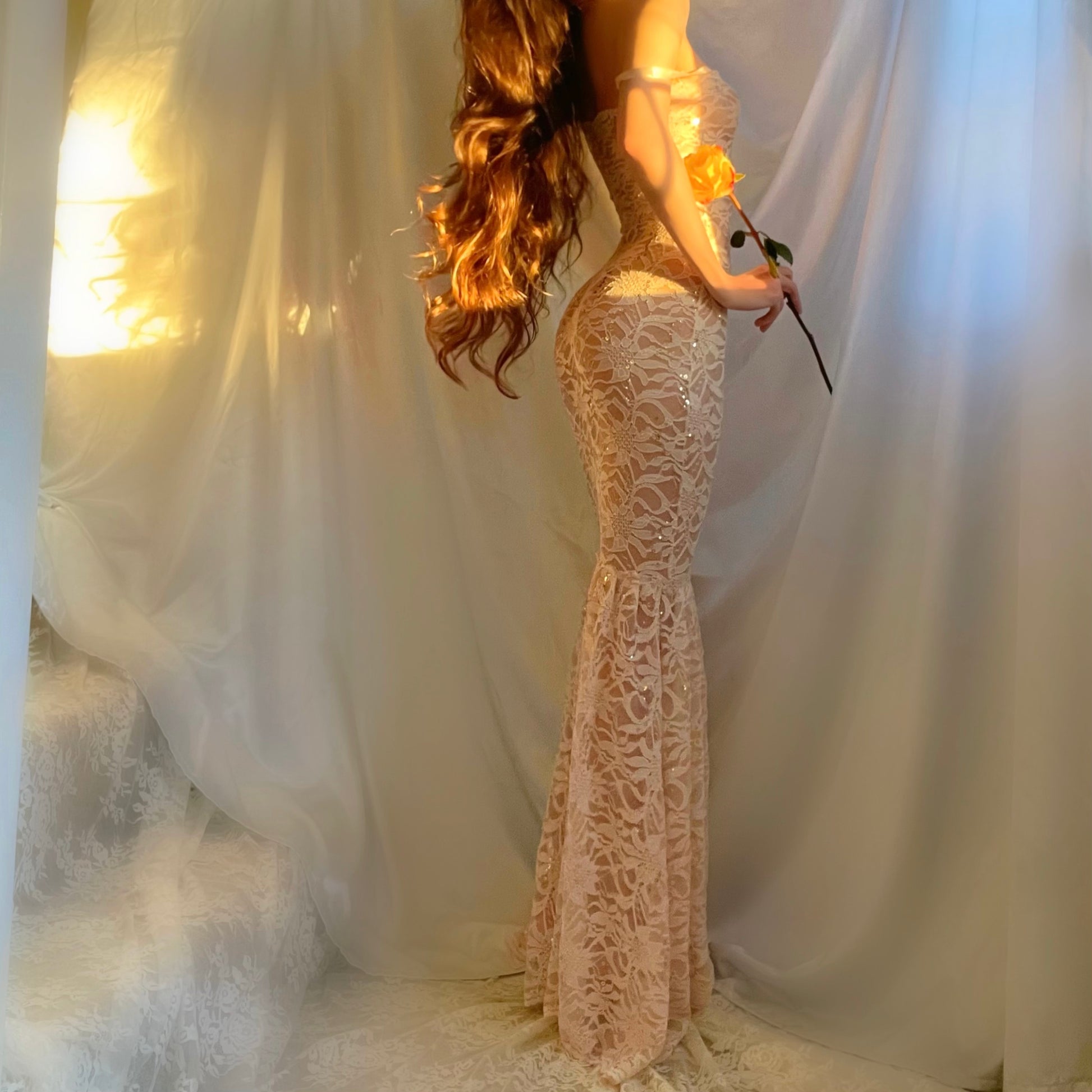 A luminous, sparkly champagne-nude mermaid lingerie dress, designed to drape like poetry on the silhouette…♡