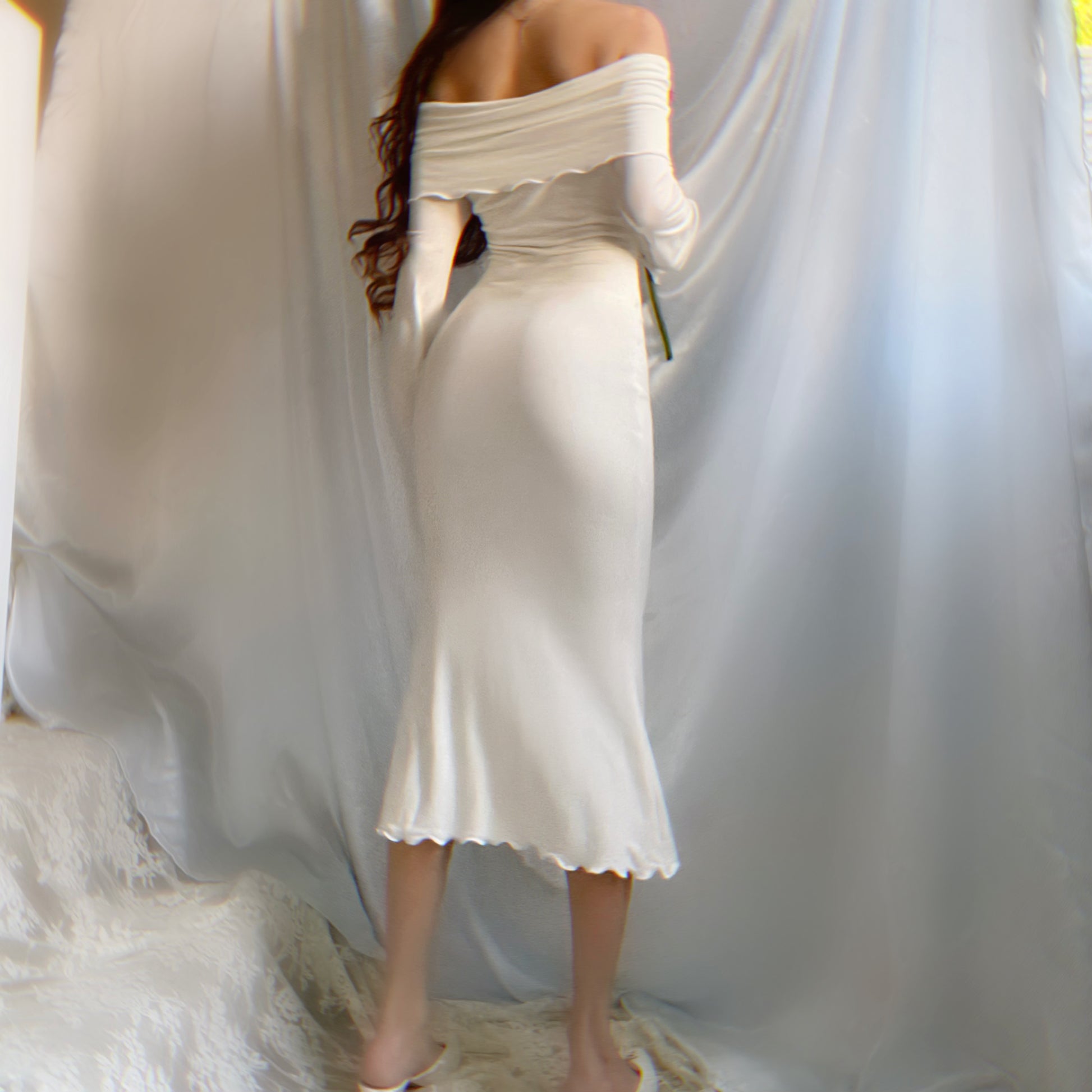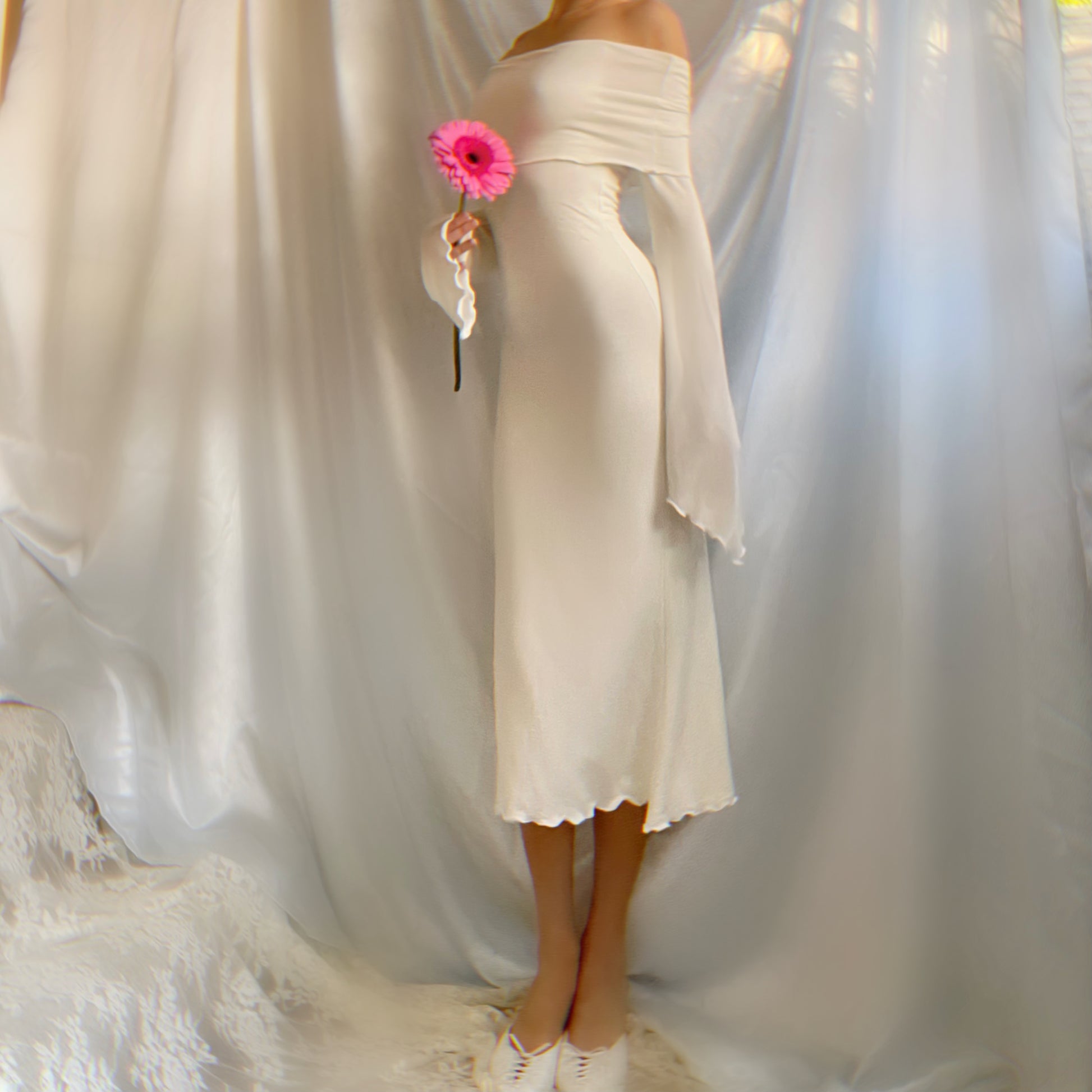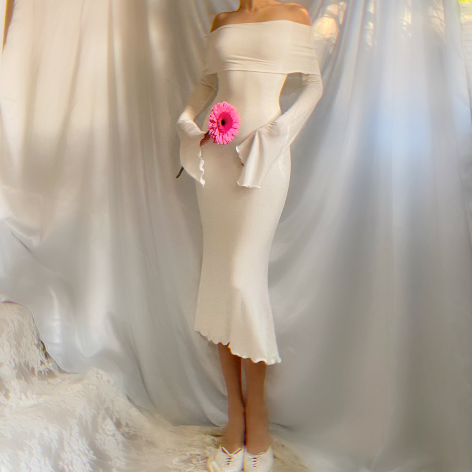 Handcrafted Aphrodite’s Angel Sleeve Off the Shoulder Mermaid Midi Dress