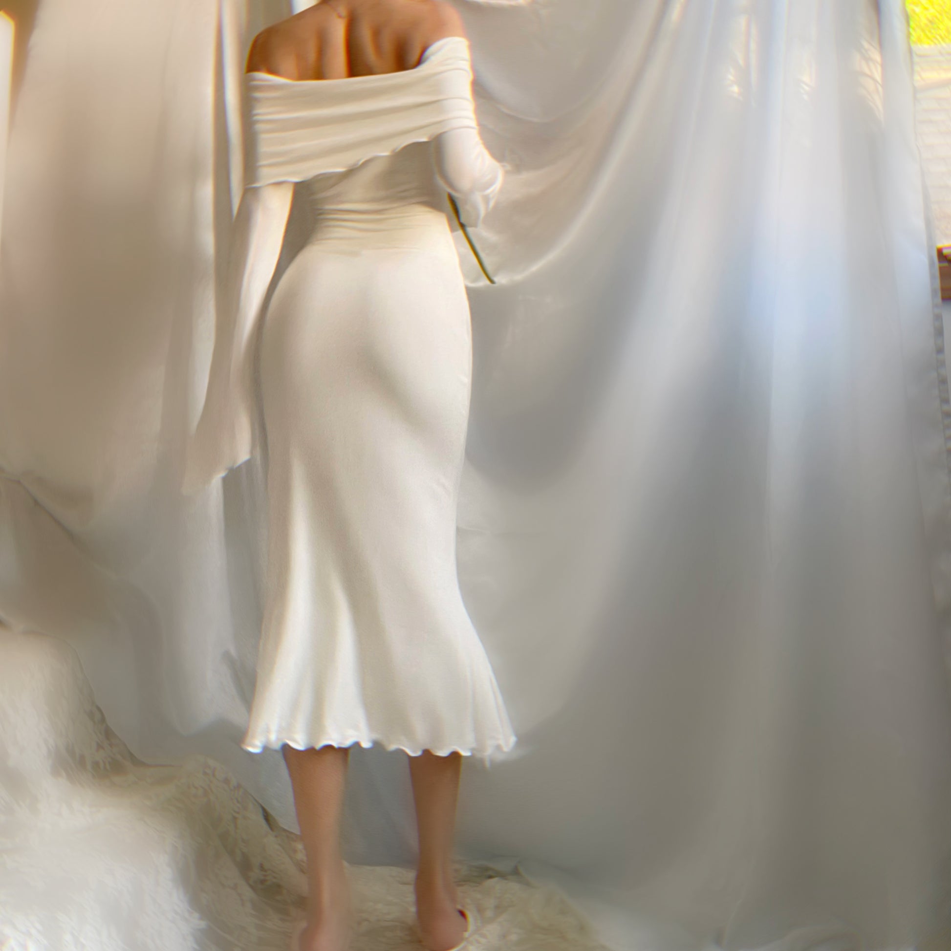 Aphrodite’s Angel Sleeve Off the Shoulder Mermaid Midi Dress