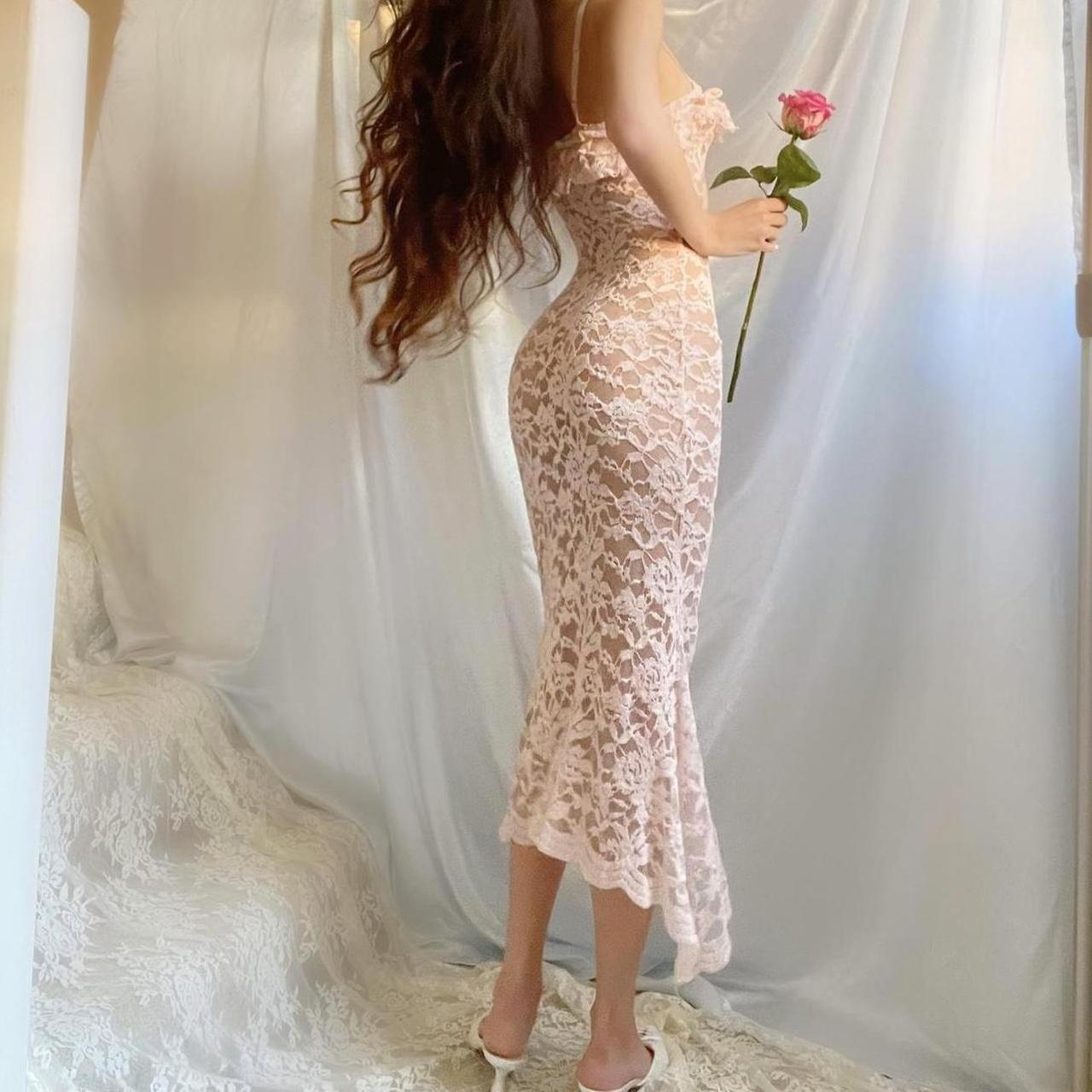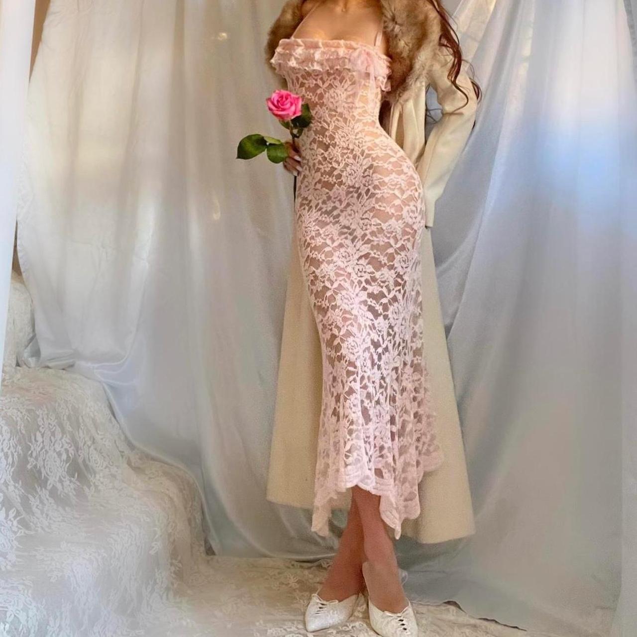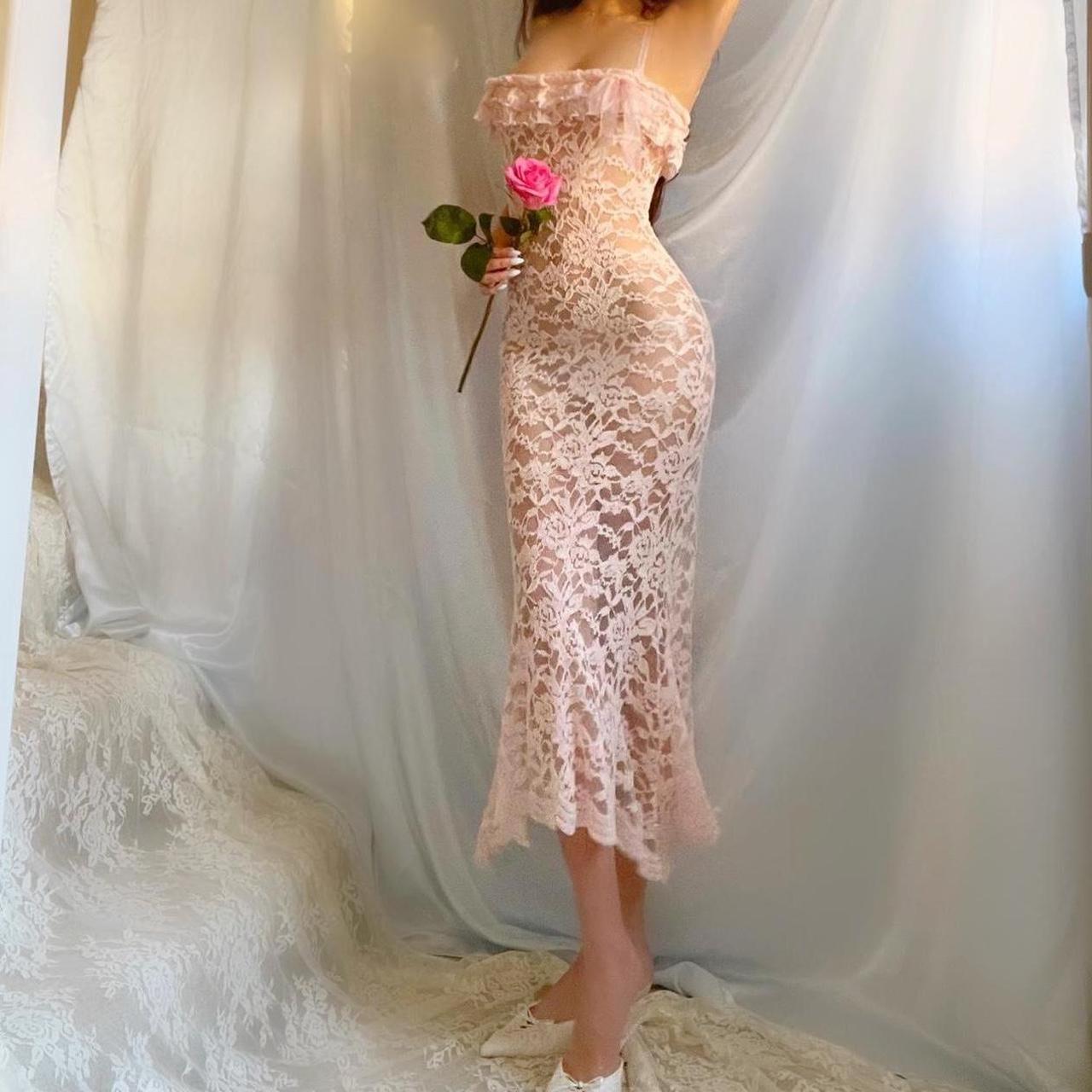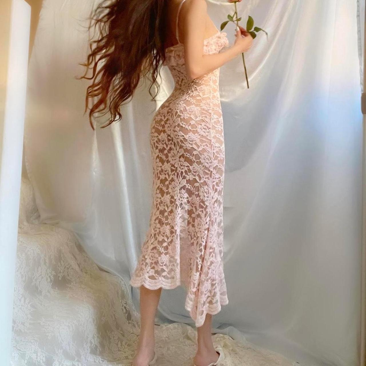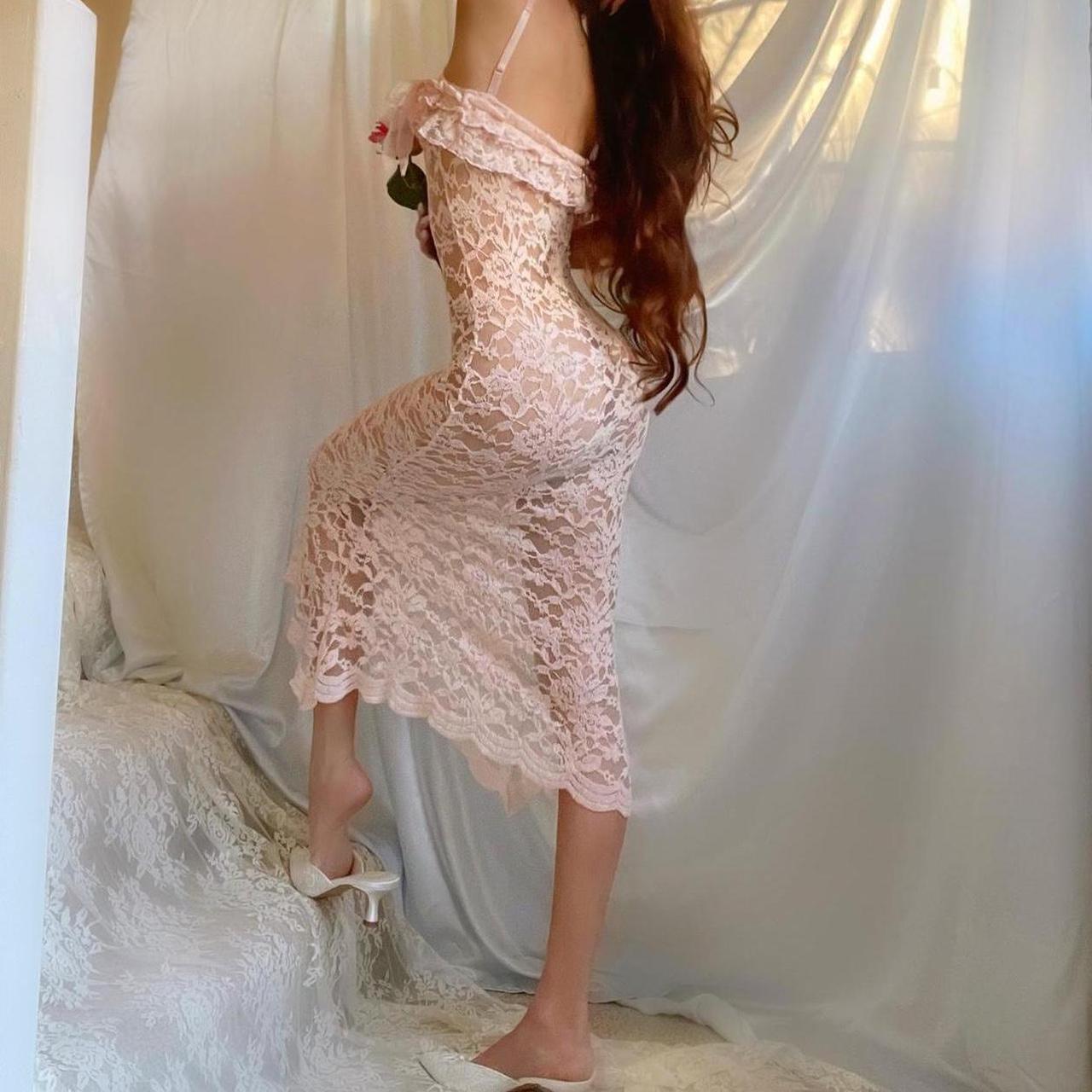 Aphrodite’s Fairy Baby Pink Lace Ruffle Asymmetric Hem Lingerie Midi Dress