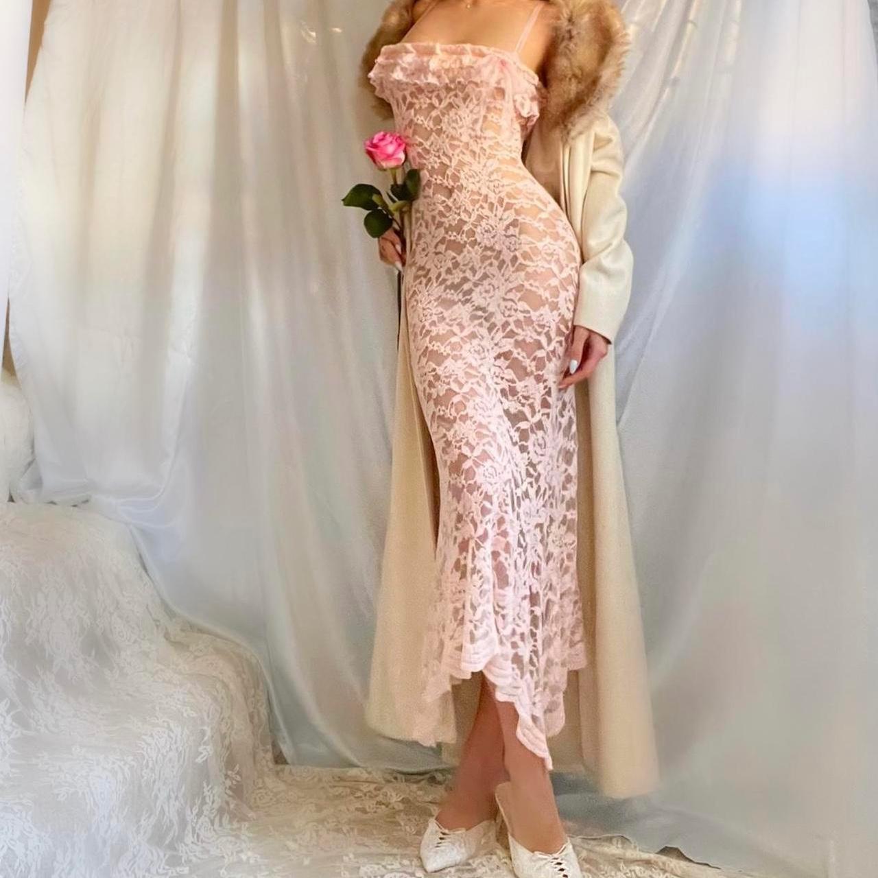 Made from a high-quality vintage embroidered lace fabric, features a raw silk bow & light pink satin straps. Is see through!