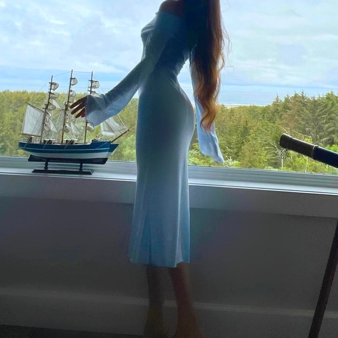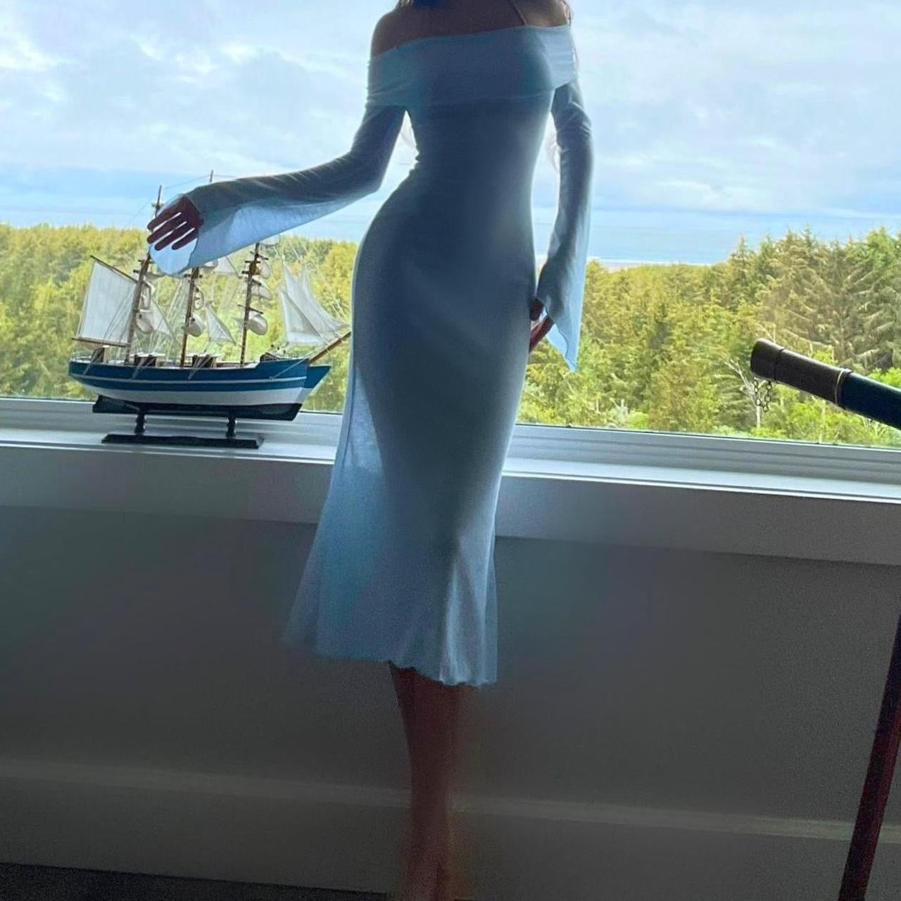 Aphrodite's Angel Baby Blue Off the Shoulder Mermaid Midi Dress