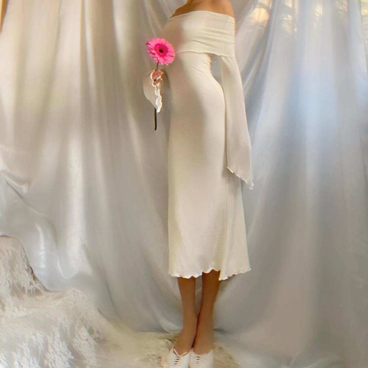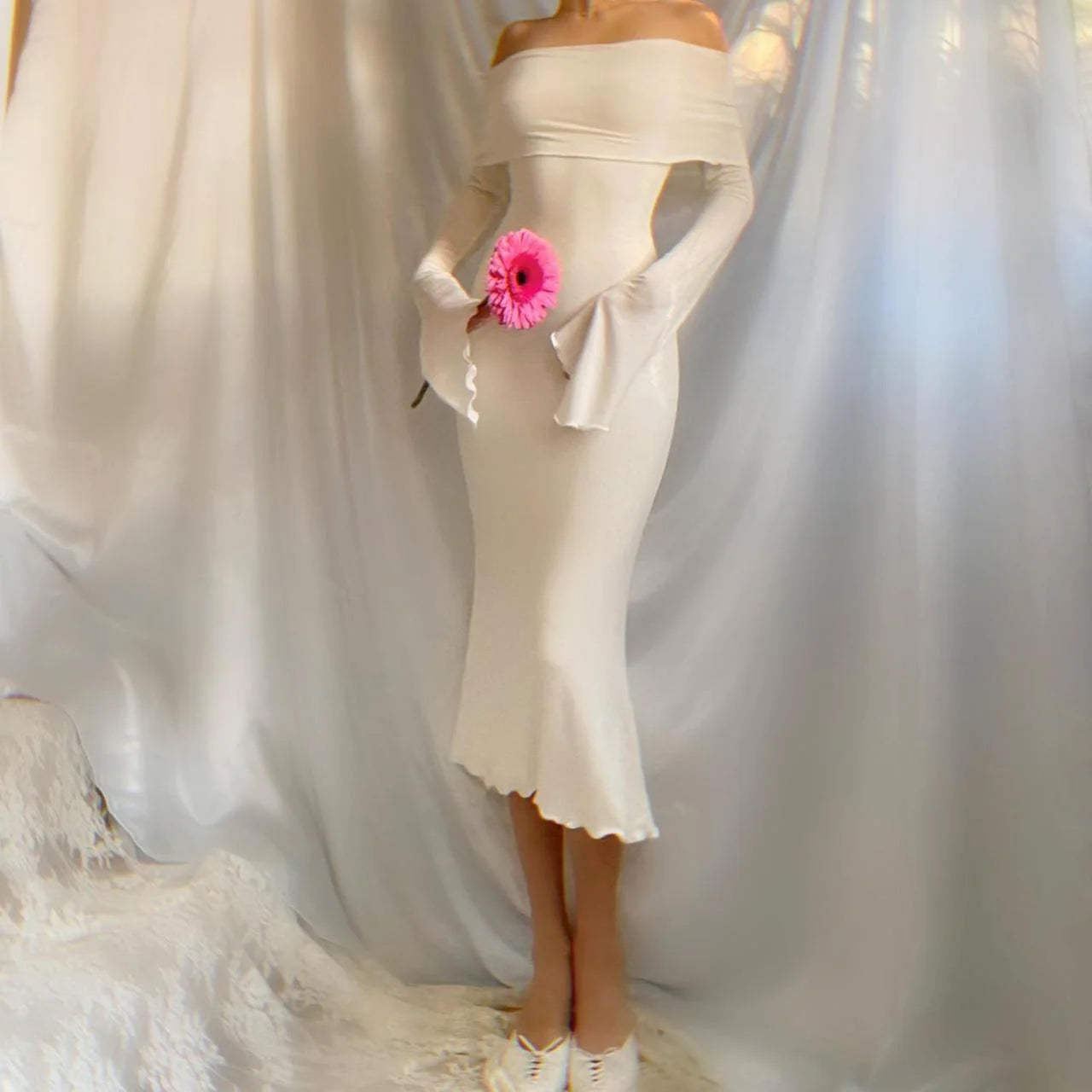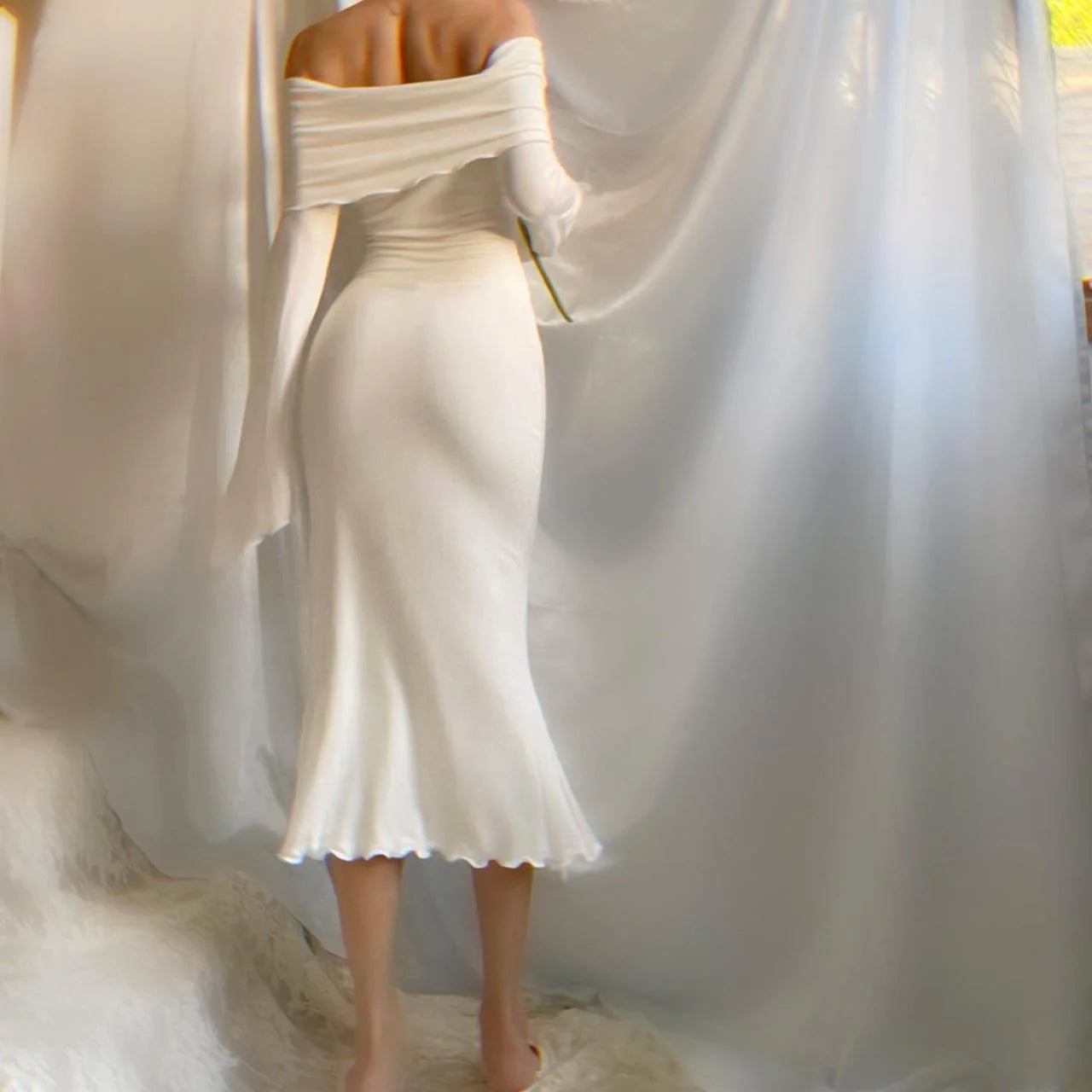 Aphrodite's Angel Pure White Off the Shoulder Mermaid Midi Dress