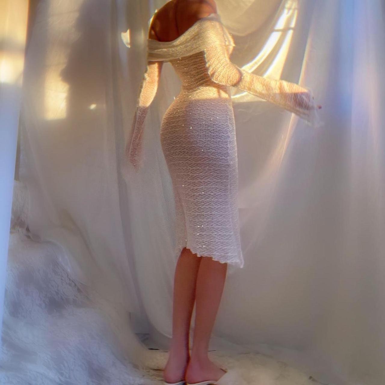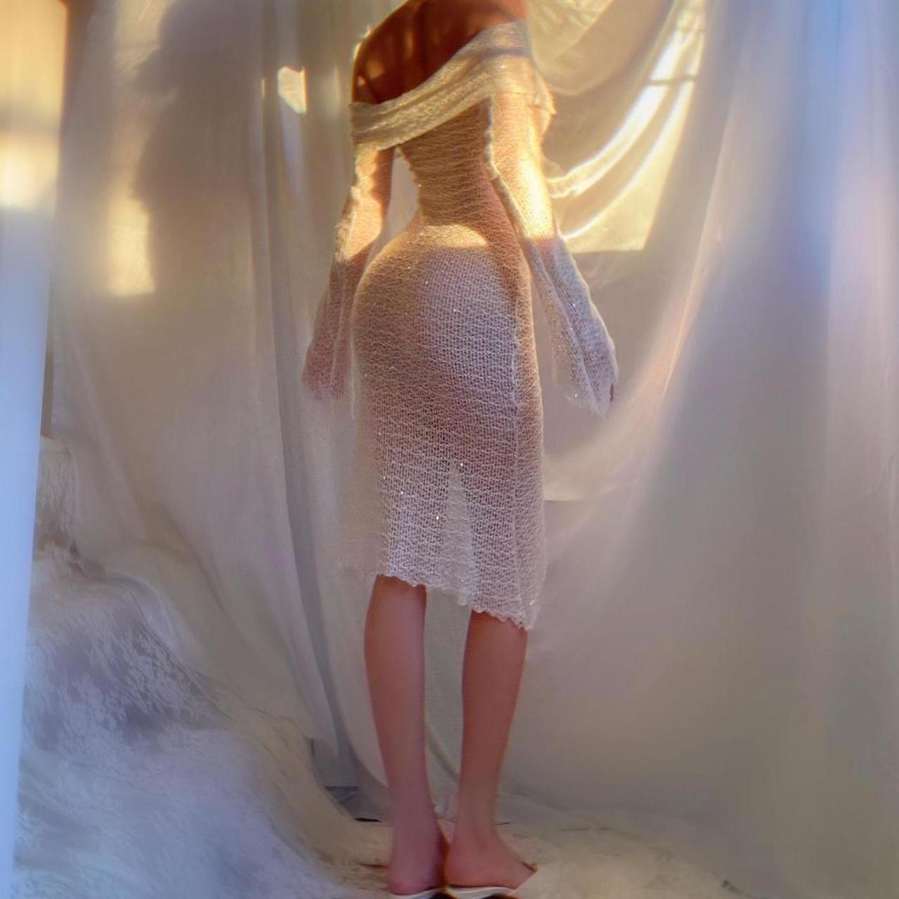 Handcrafted White Sparkly Crochet Angel Sleeve Off the Shoulder Mermaid Dress.Β Size XS. One-of-one.