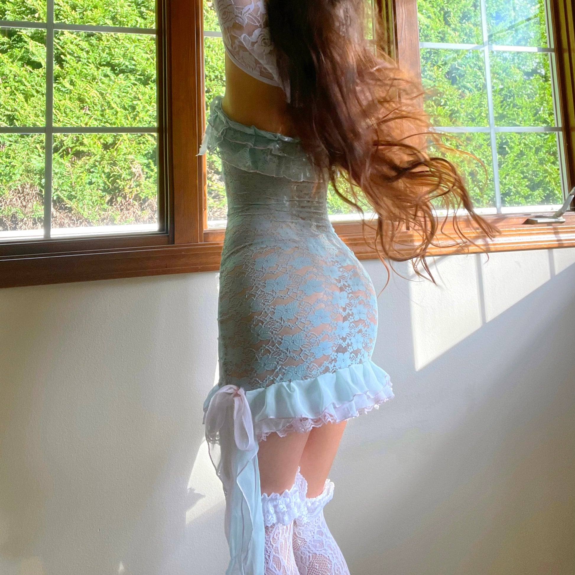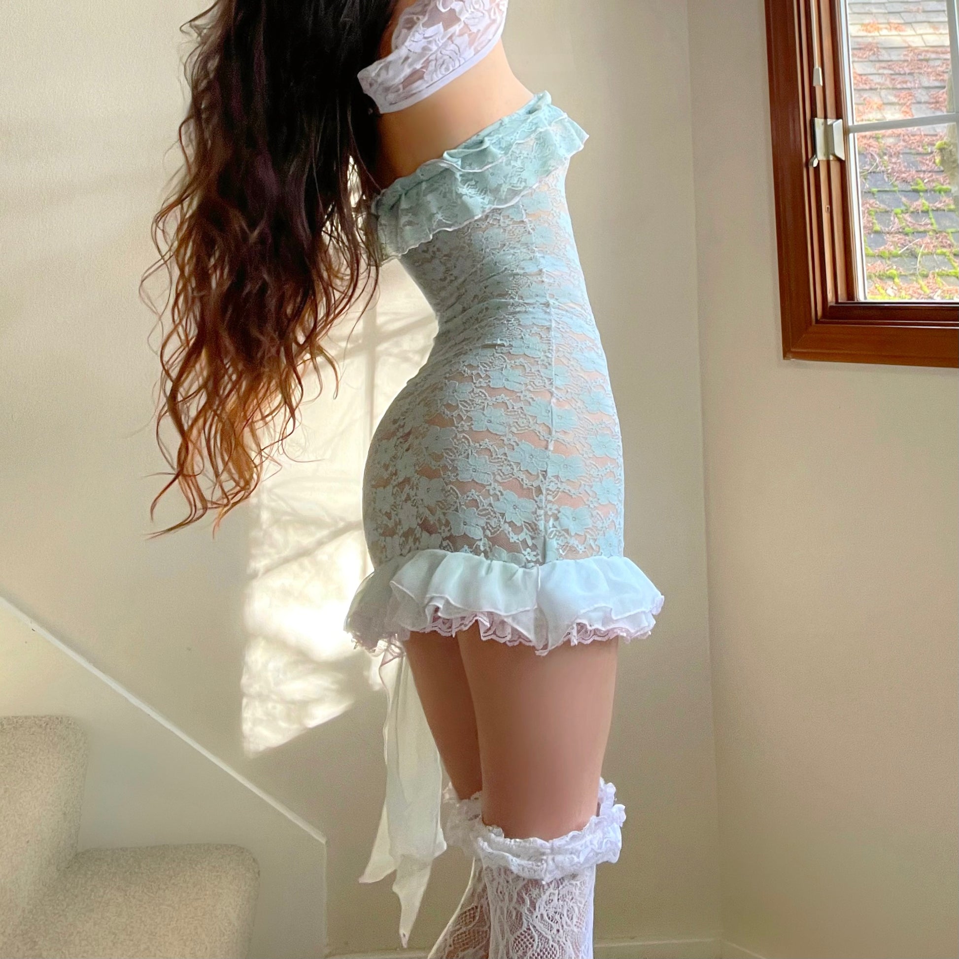 - Created with a super pretty aqua/sea green lace fabric, and a high-quality silk!