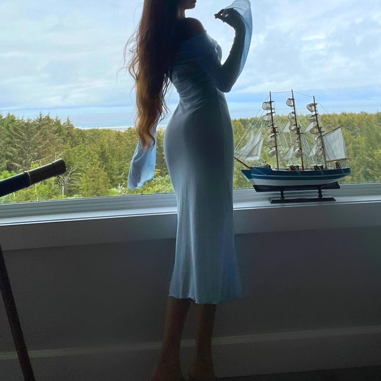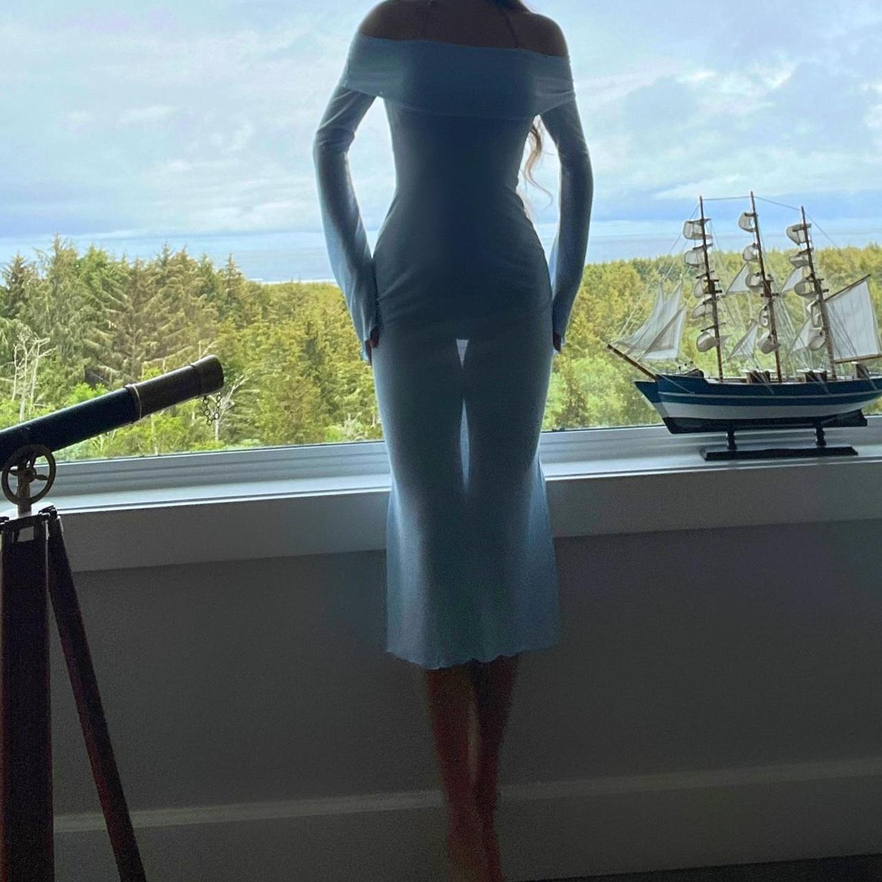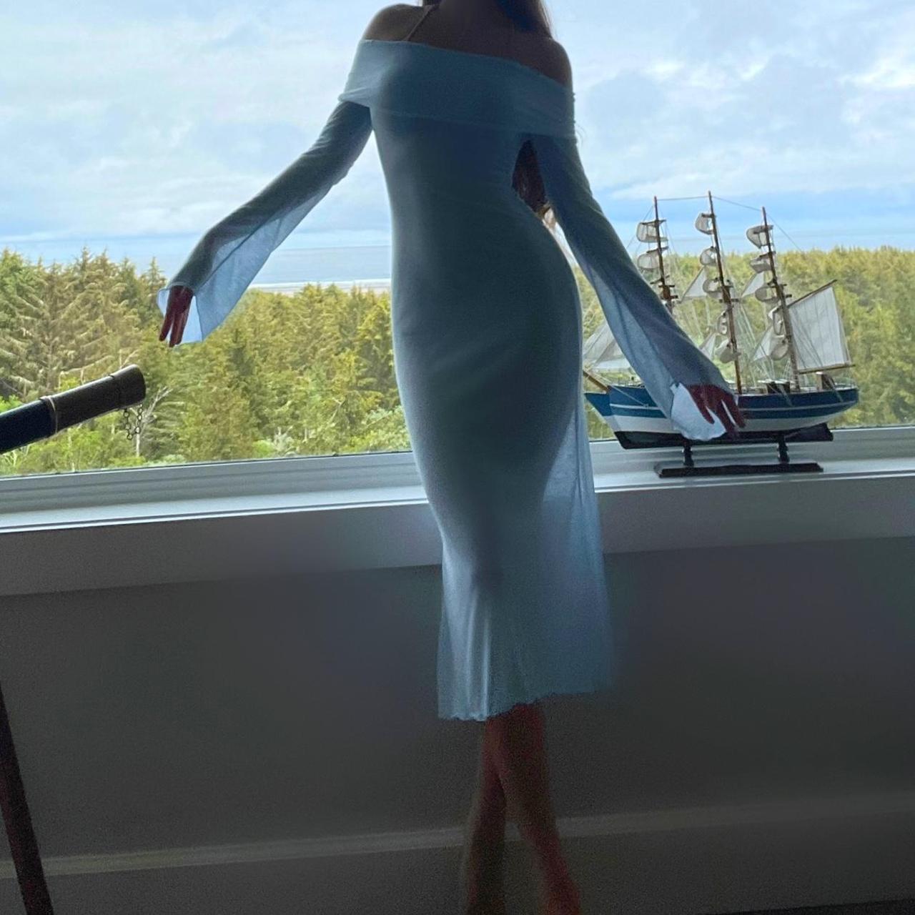Made with a high-quality baby blue stretchy rayon fabric, imported from Italy. Super soft, dainty and lightweight. Feels amazing on! Is see through so would best work as a beach/vacation coverup or as a lingerie dress! Seen styled on model with a bikini underneath🦋
