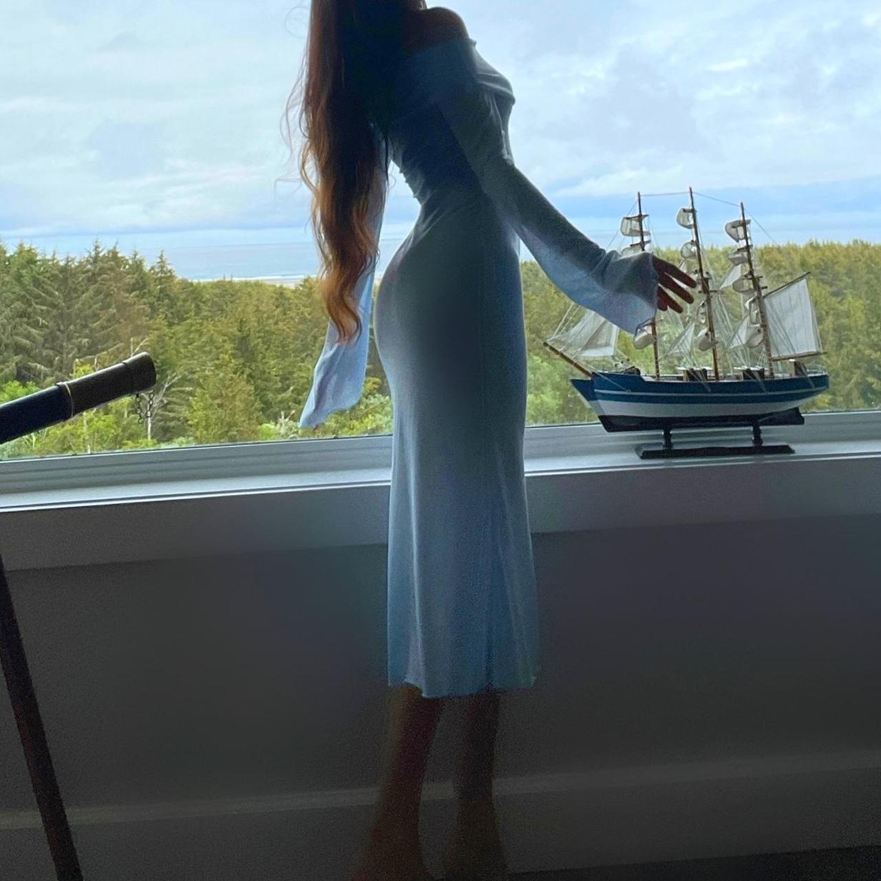 Baby Blue Beach Goddess Off the Shoulder Angelic Midi Dress (Sample Piece)
