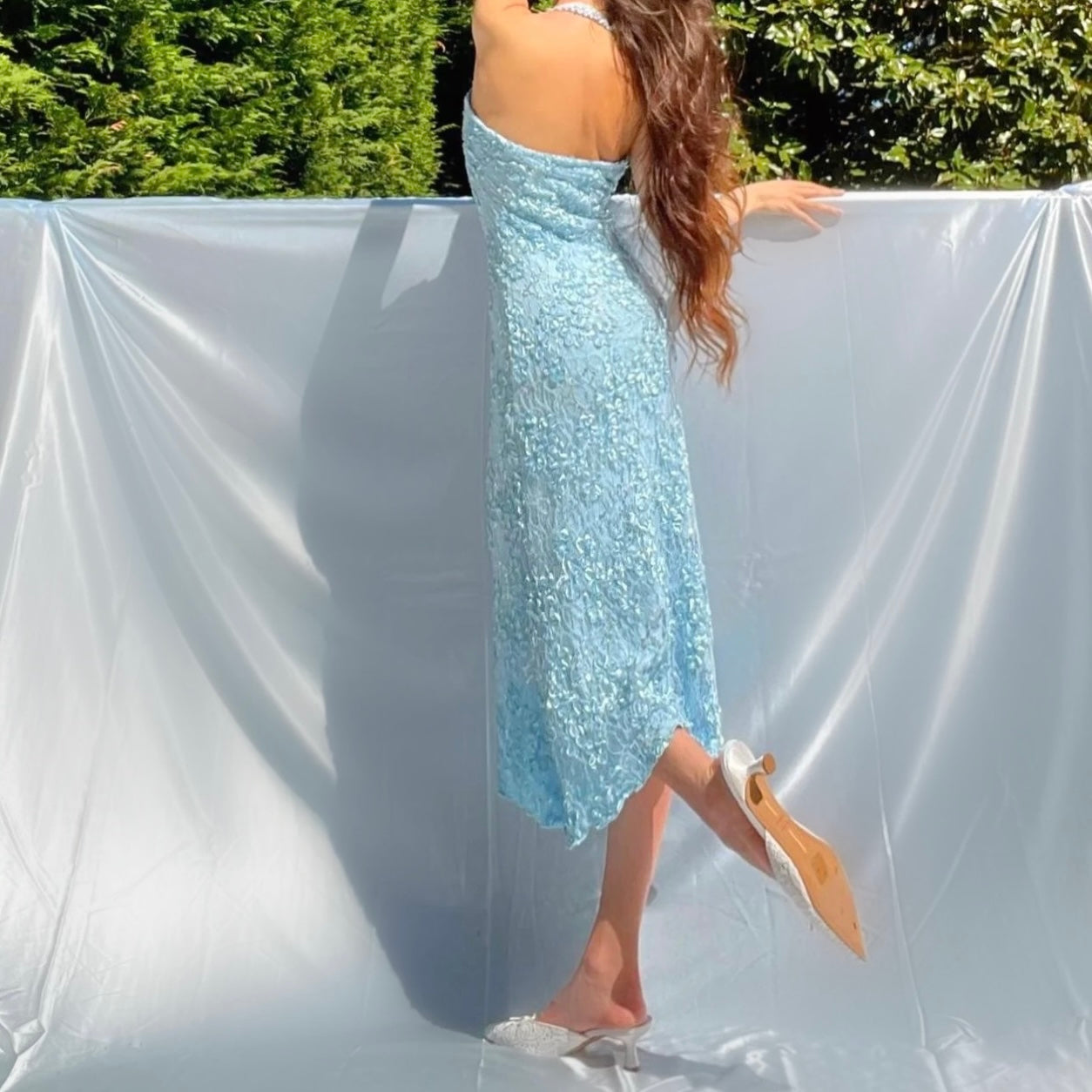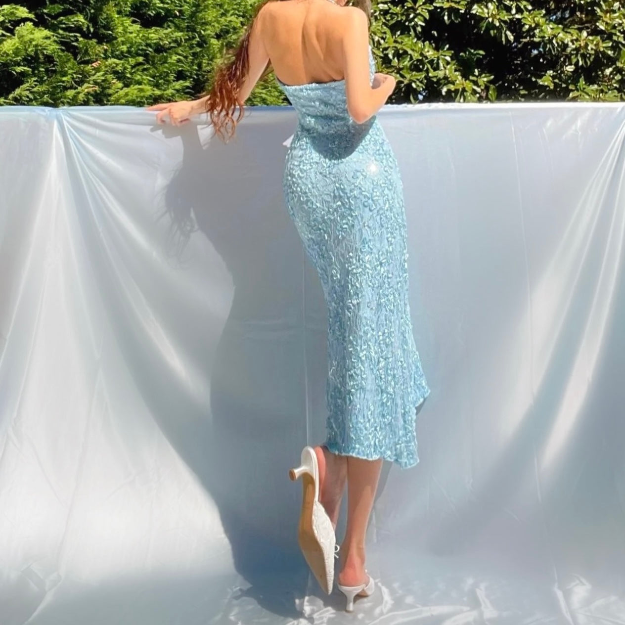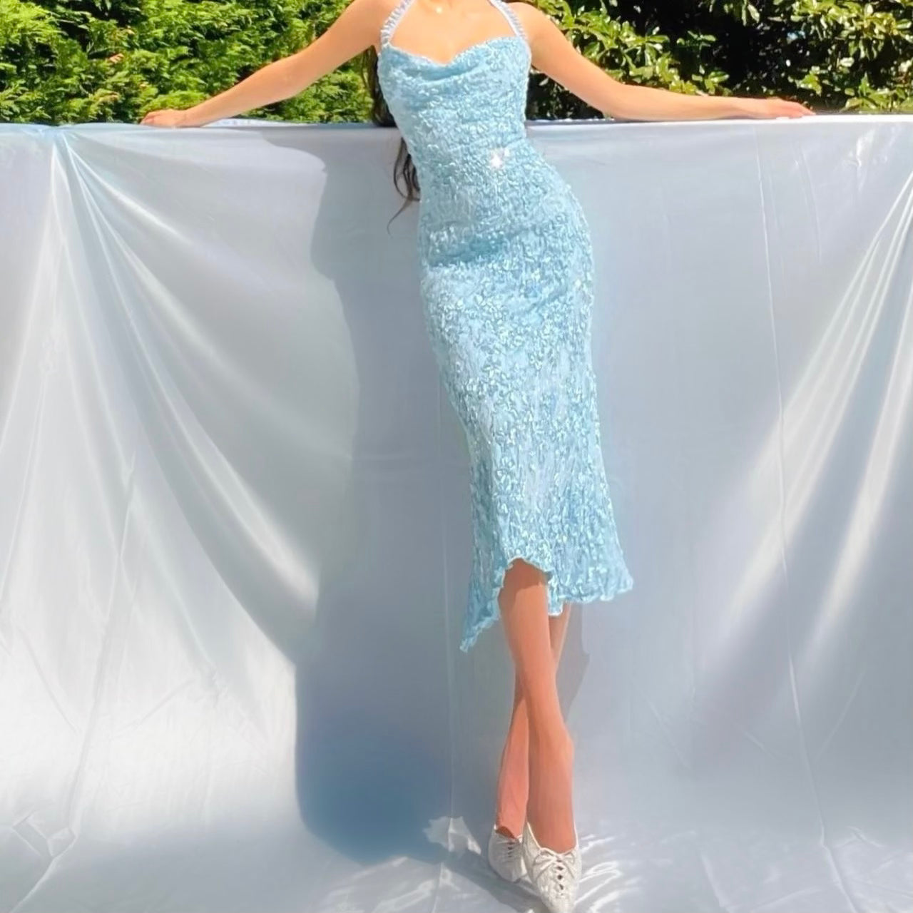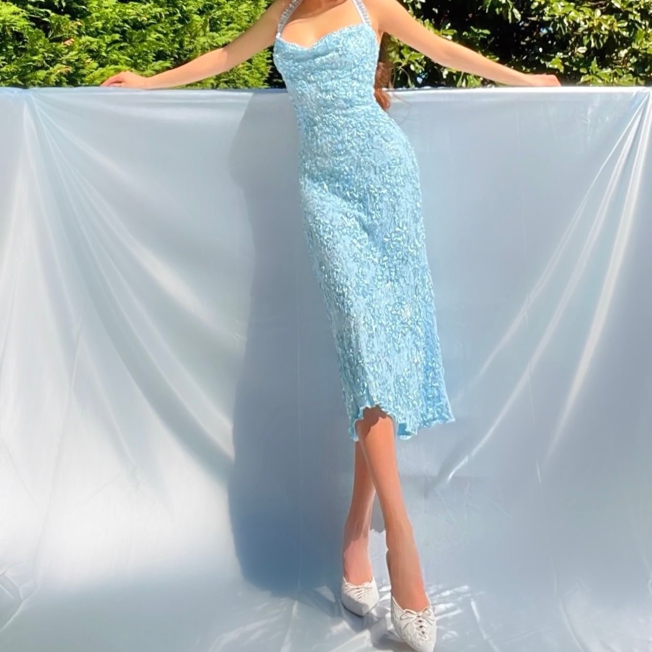 Baby Blue Sparkly Lace Cowl Neck Mermaid Midi Dress