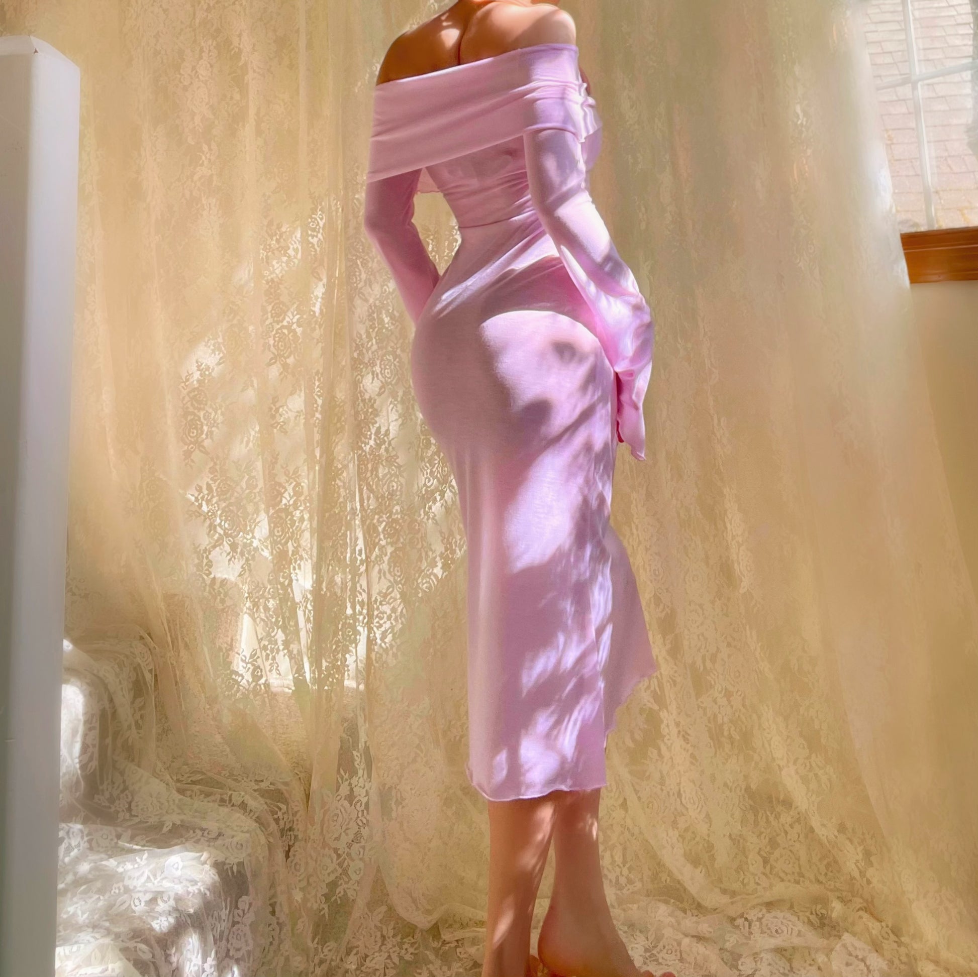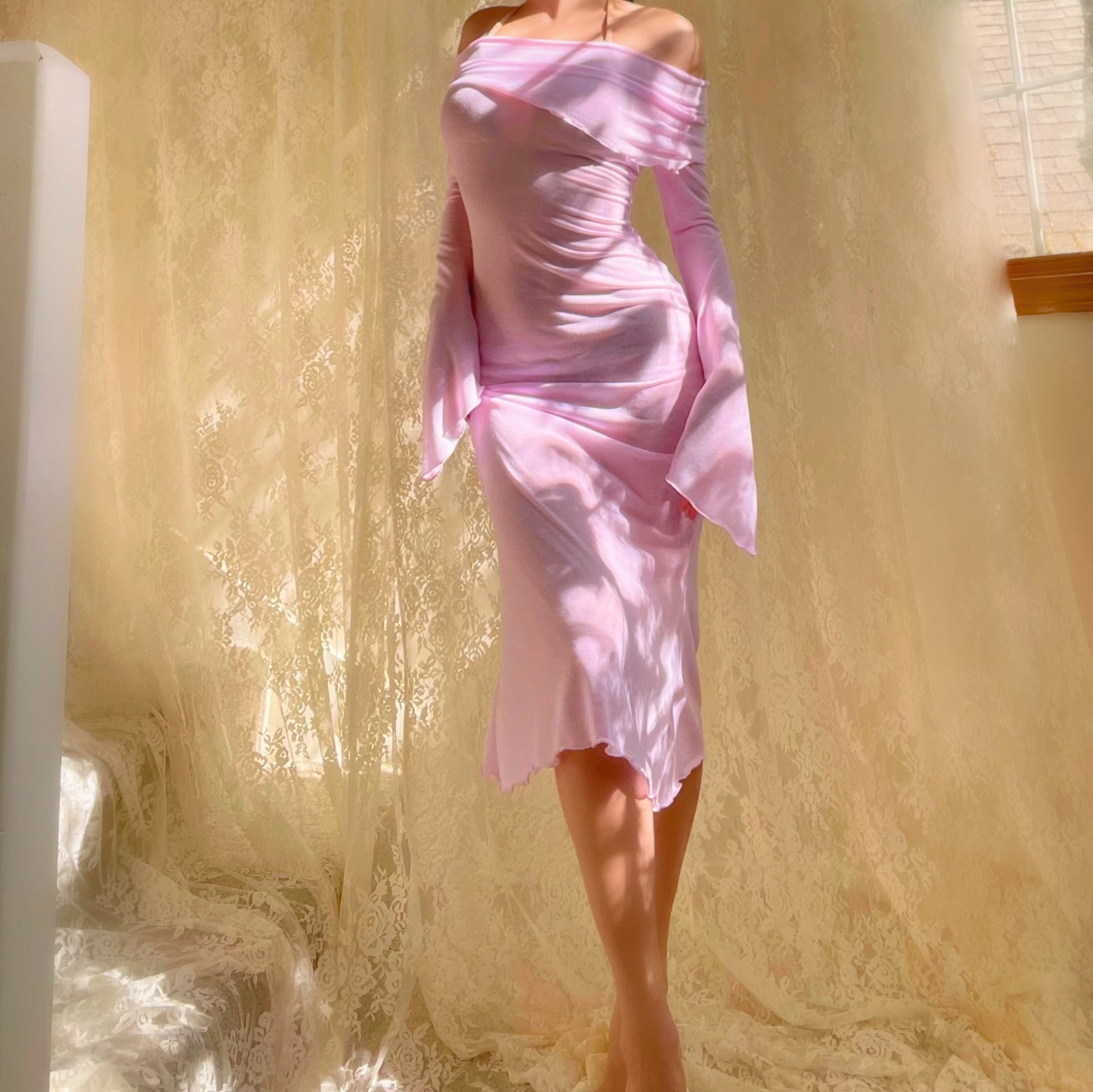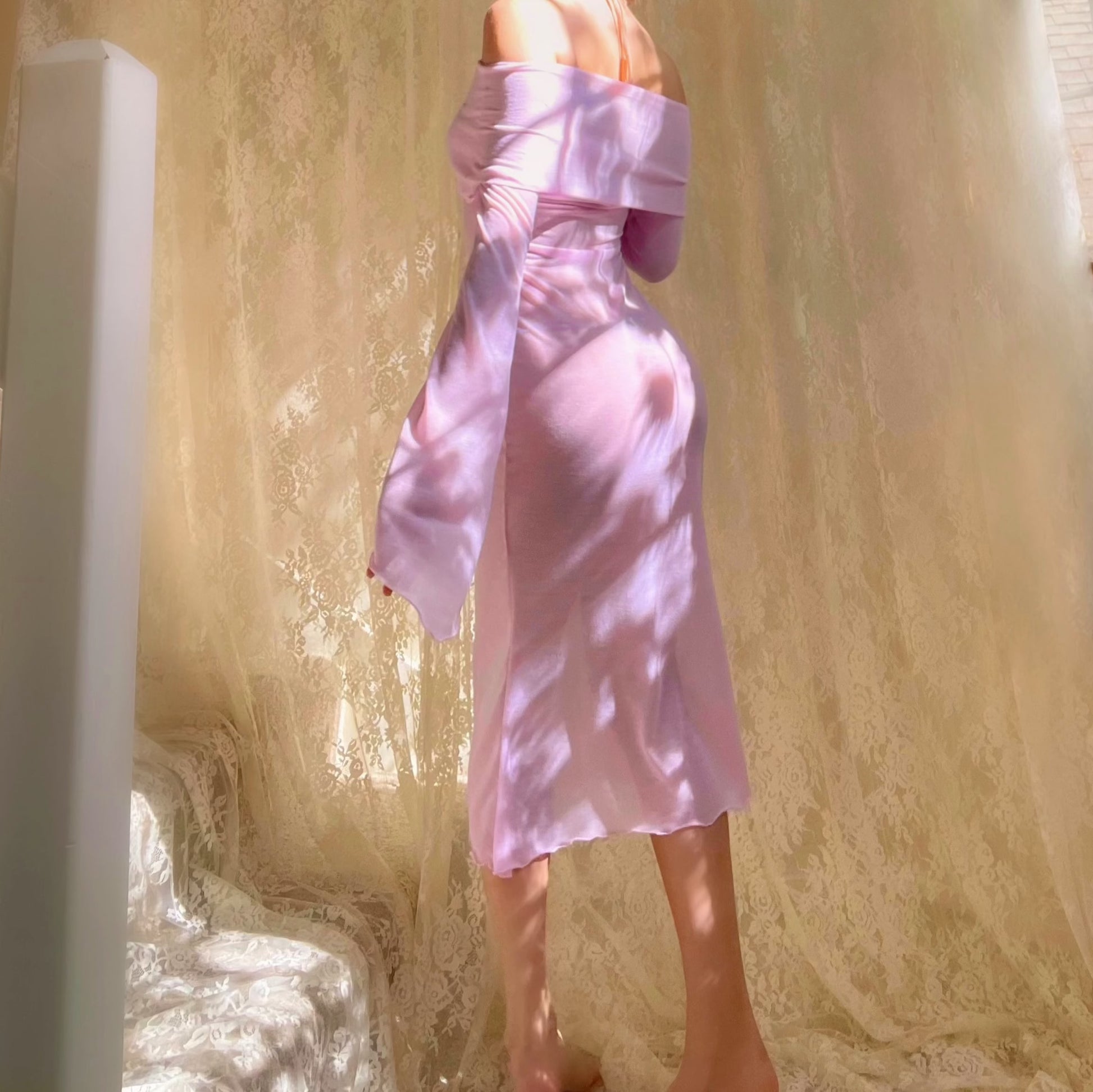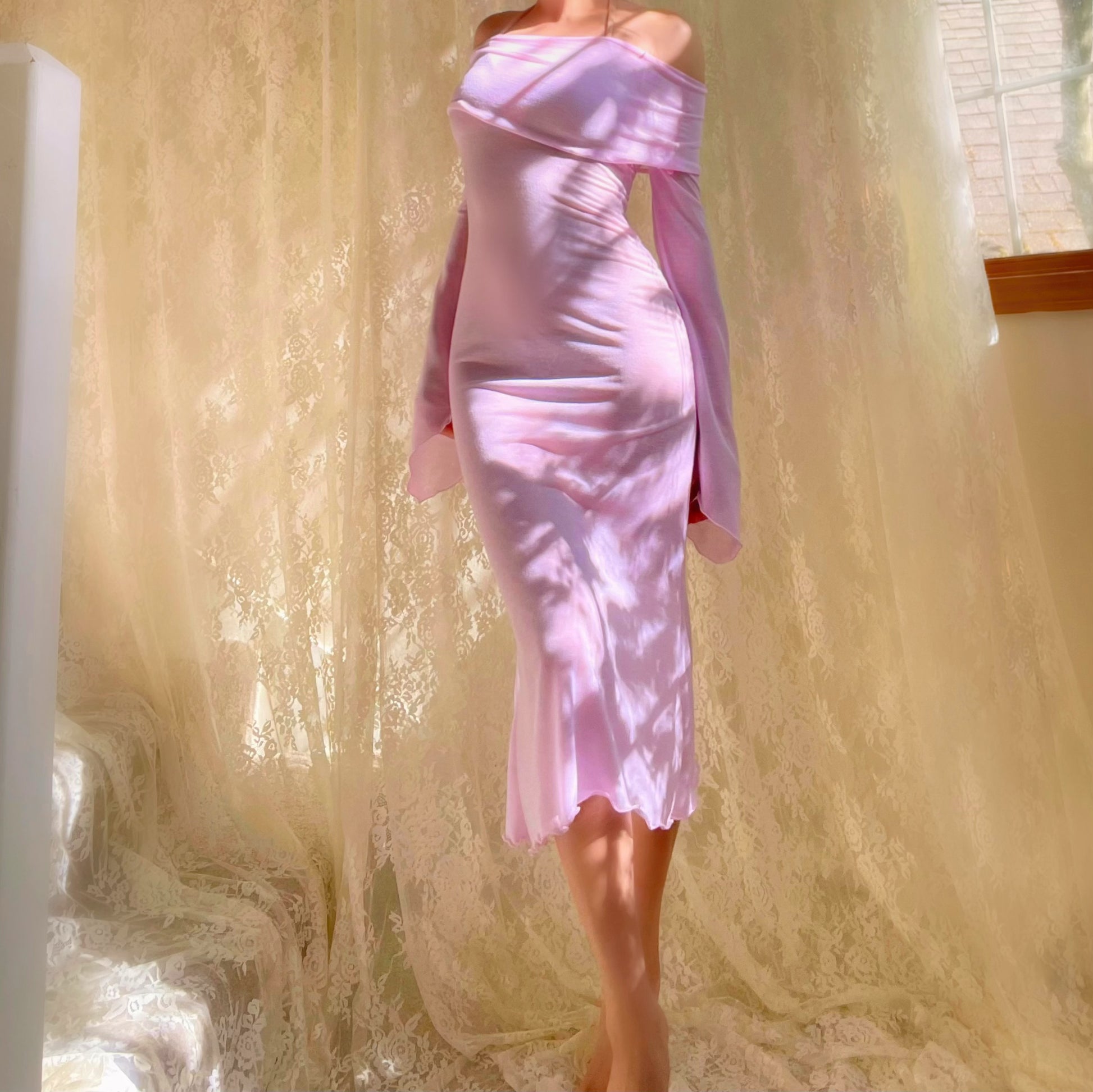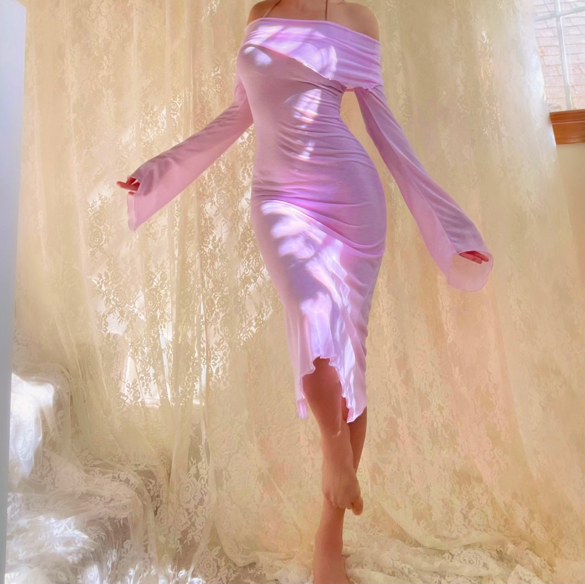 Made with a high-quality lilac/pink stretchy jersey fabric. Super soft, dainty and lightweight. Feels amazing on! A bit see through so would best work as a beach/vacation coverup or as a lingerie dress! Seen styled on model with a bikini underneath.