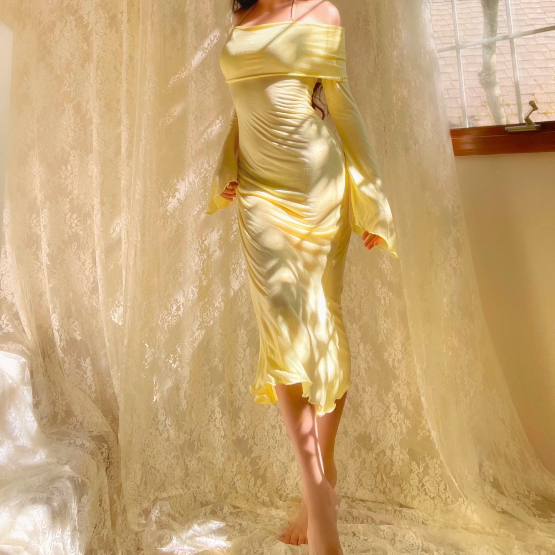 Made with a high-quality light yellow stretchy jersey fabric. Super soft, dainty and lightweight. Feels amazing on! A bit see through so would best work as a beach/vacation coverup or as a lingerie dress! Seen styled on model with a bikini underneath.