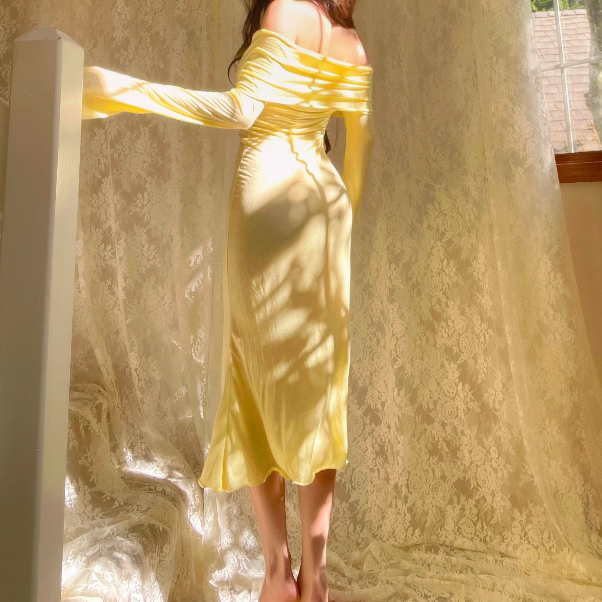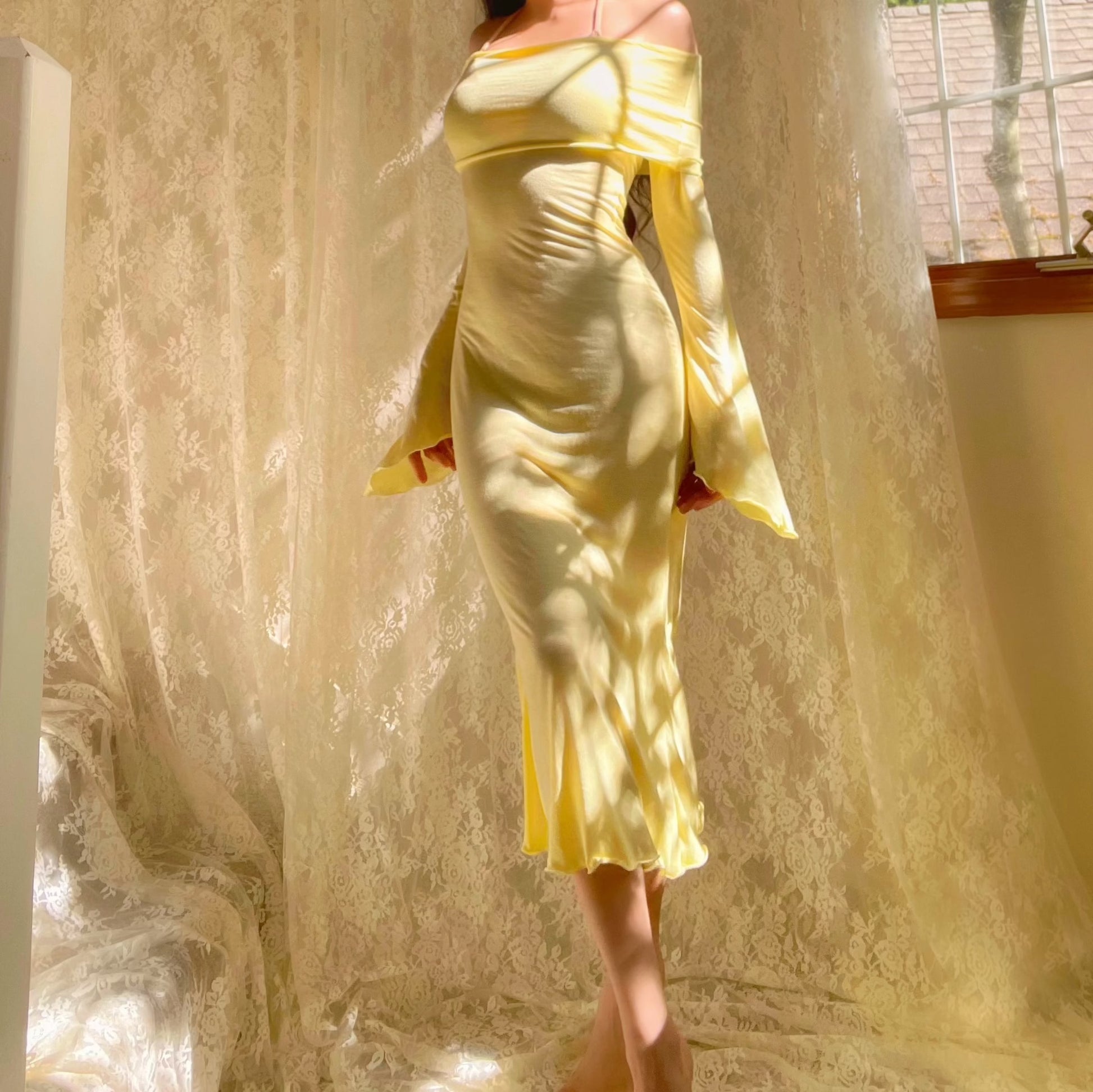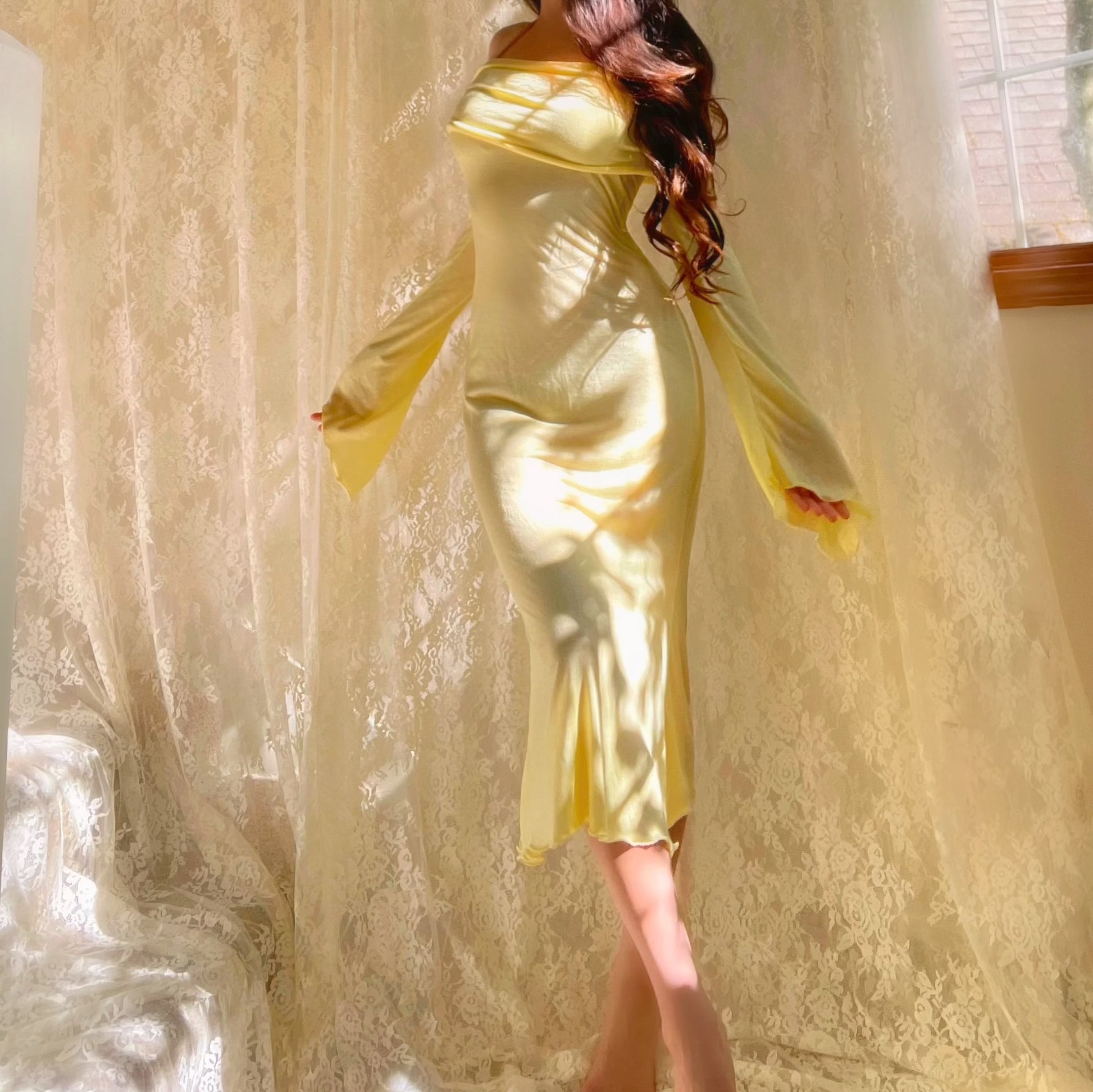 Beach Goddess Yellow Off the Shoulder Angelic Midi Dress