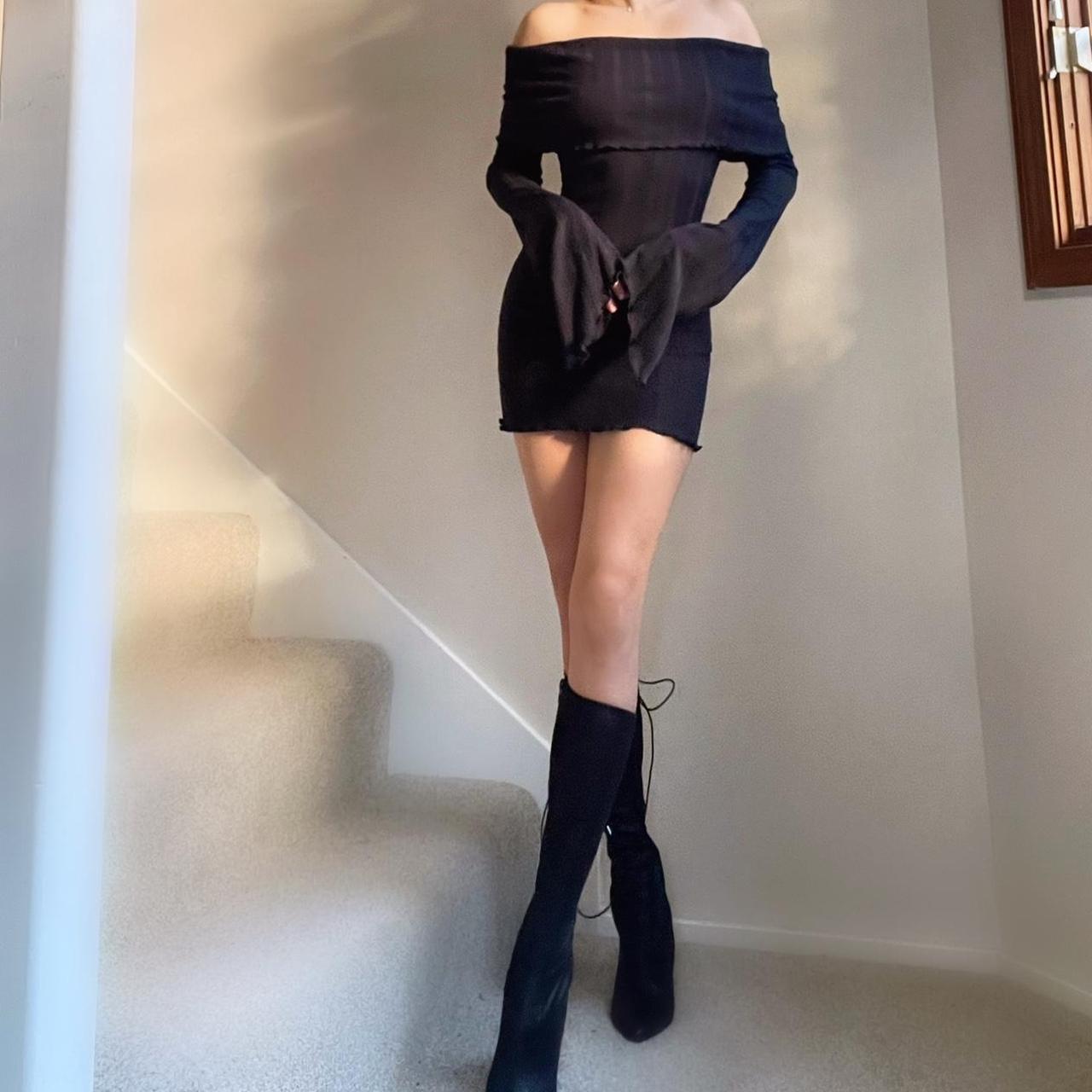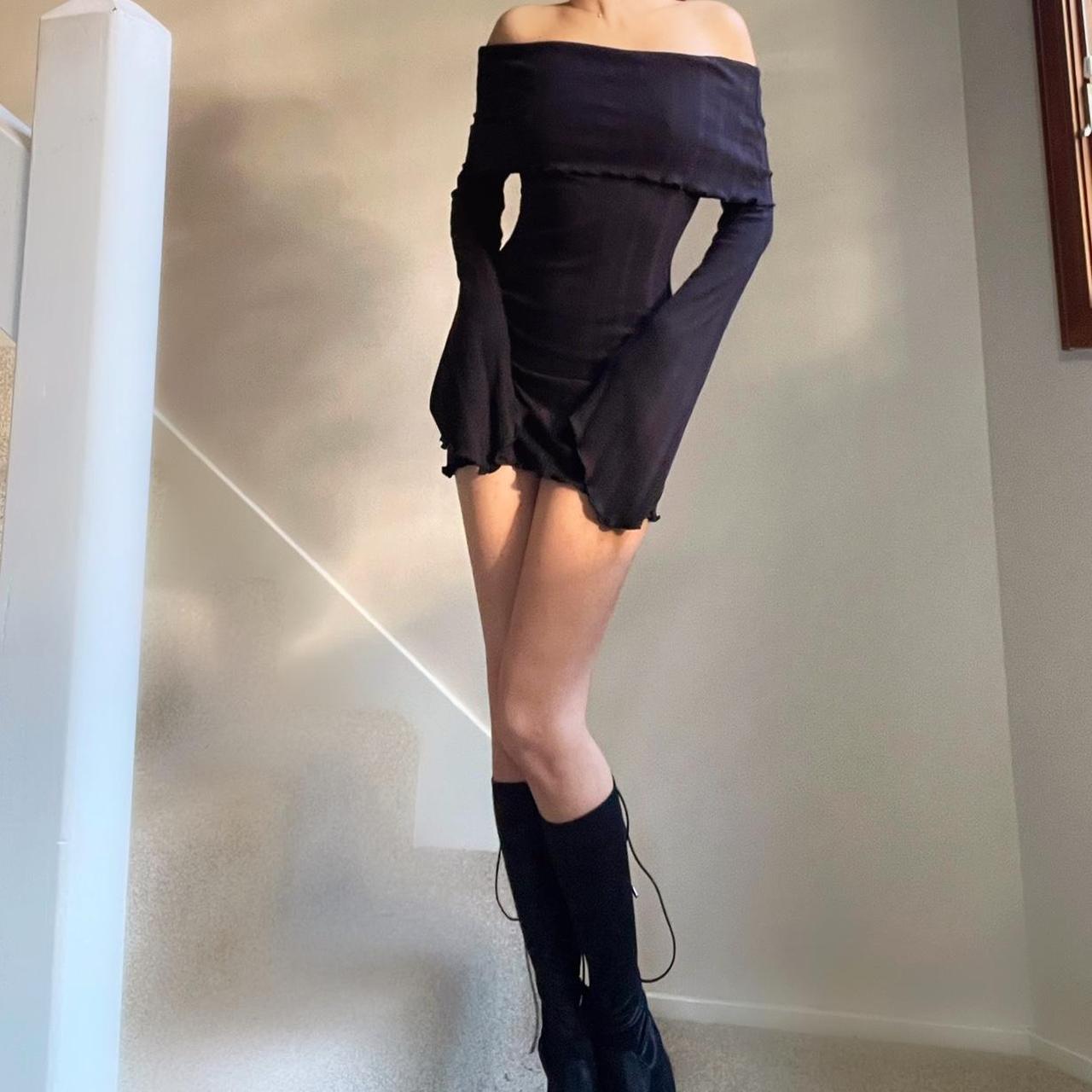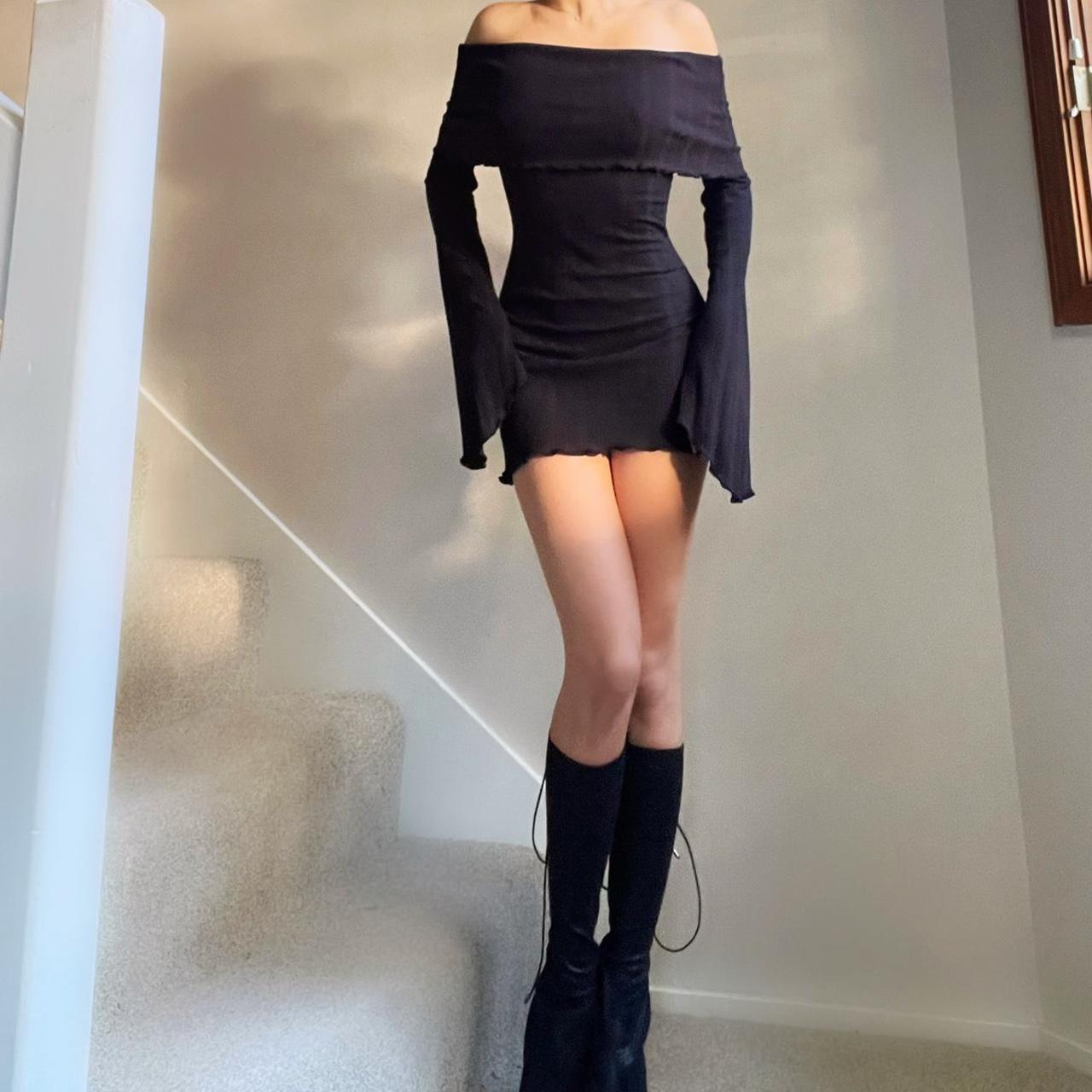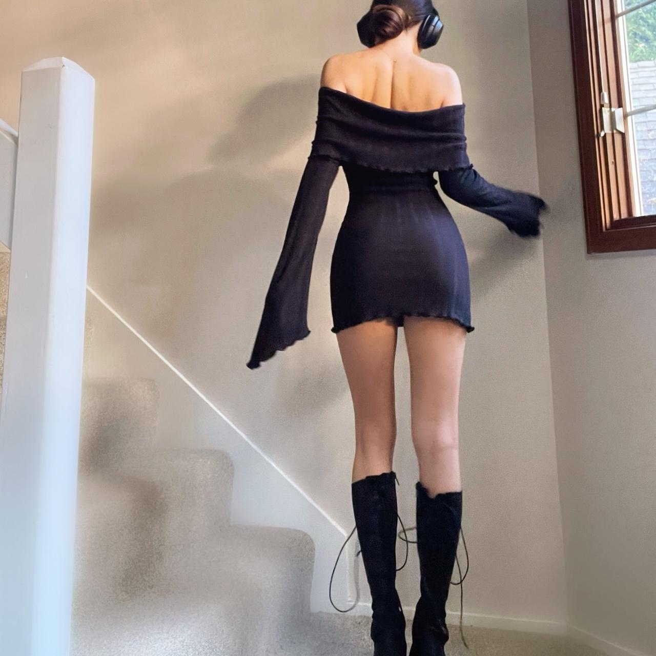 Handmade black see through ribbed off the shoulder flared angel sleeve ultra mini dress