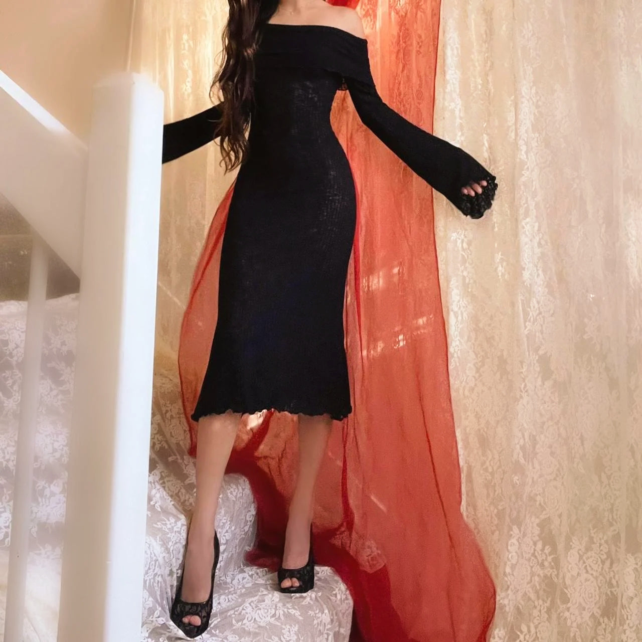 Black Ribbed Off the Shoulder Angel Sleeve Midi Dress