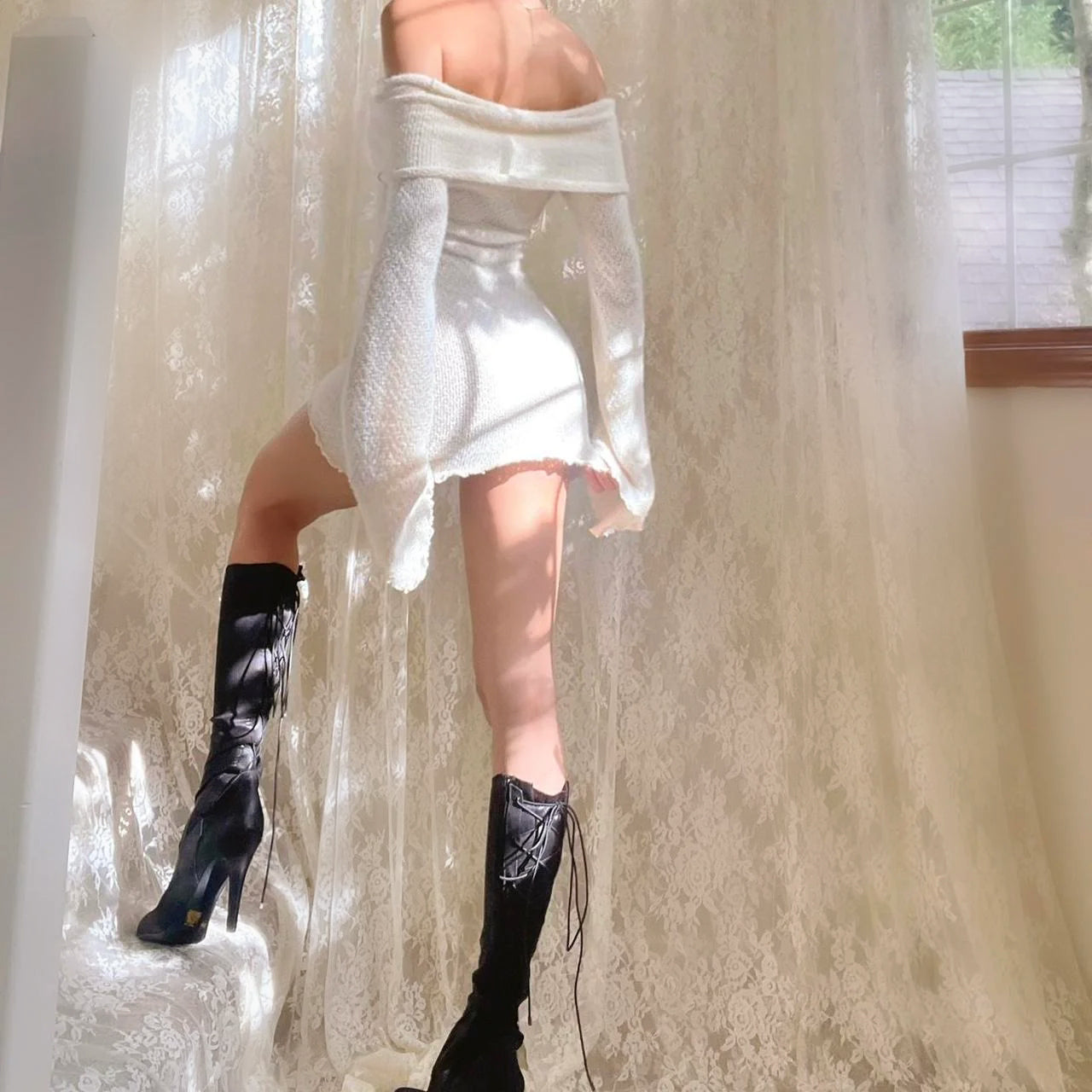 Ivory Off the Shoulder Angel Sleeve Mini Dress