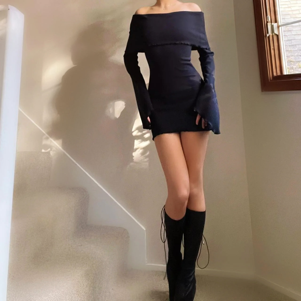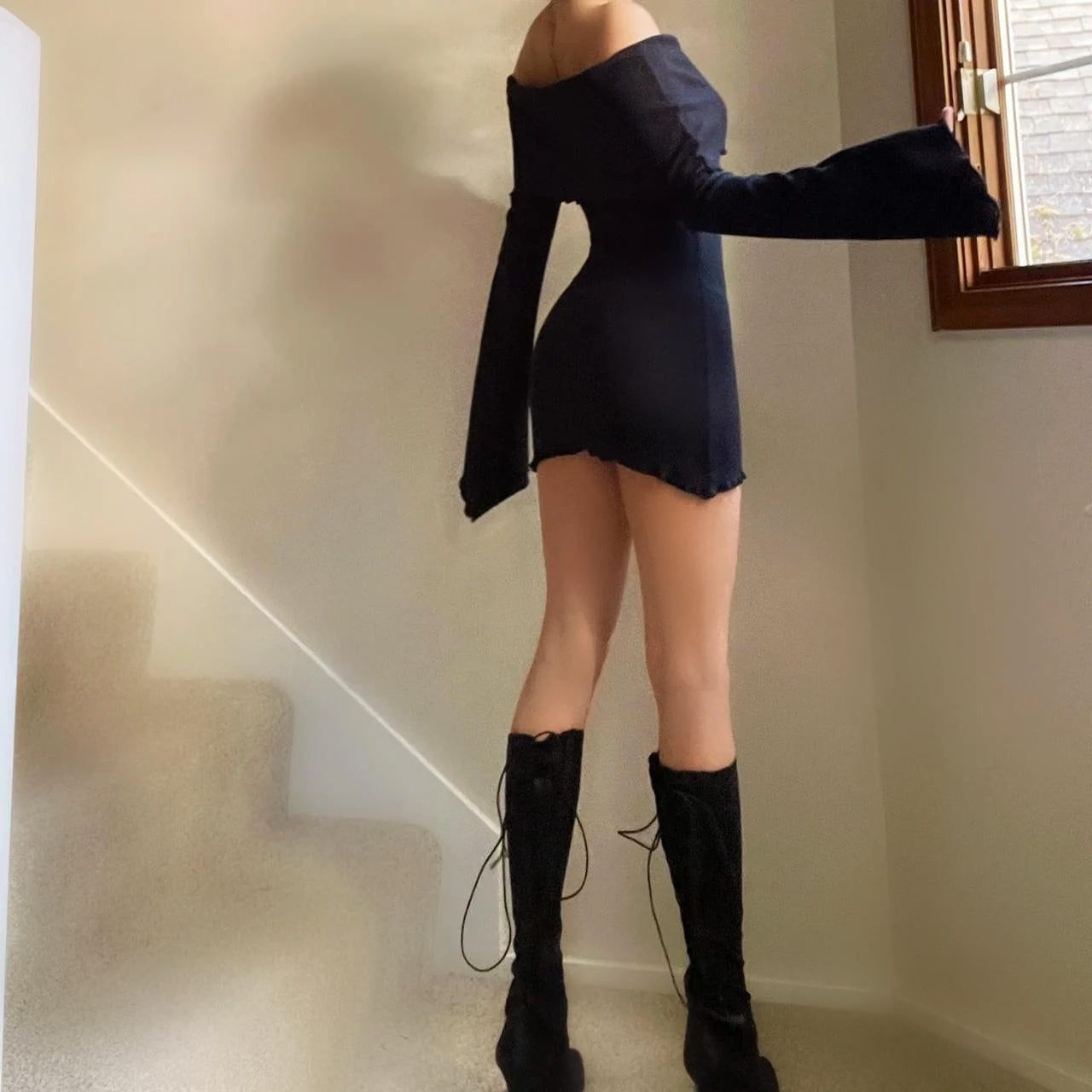 Black Ribbed Off the Shoulder Angel Sleeve Dress