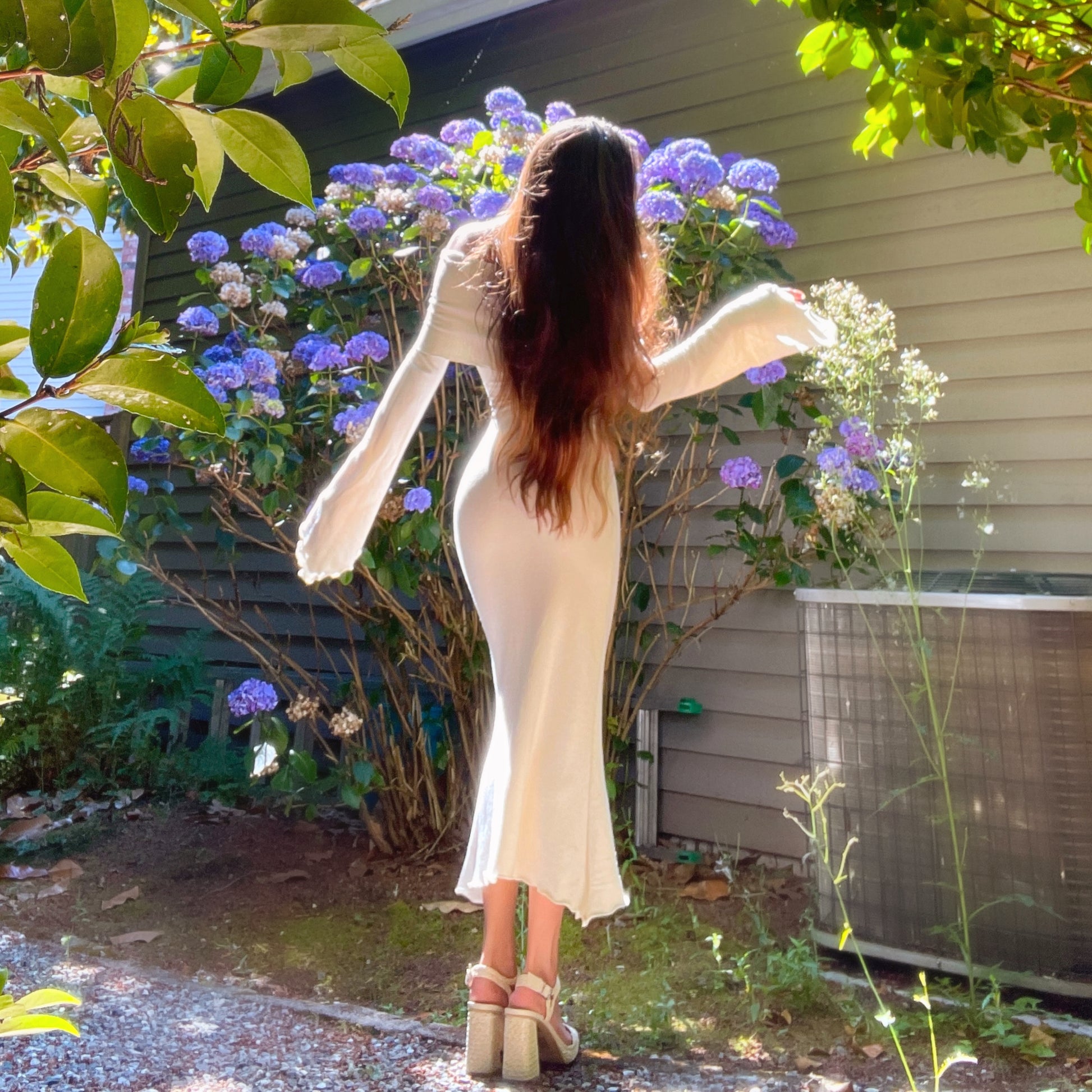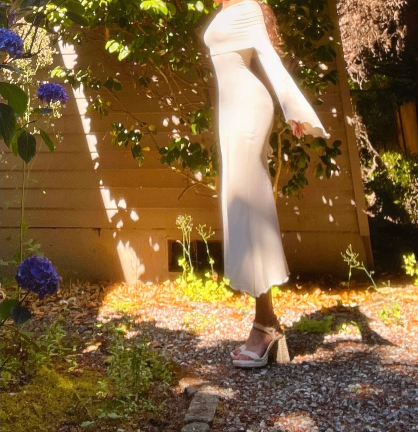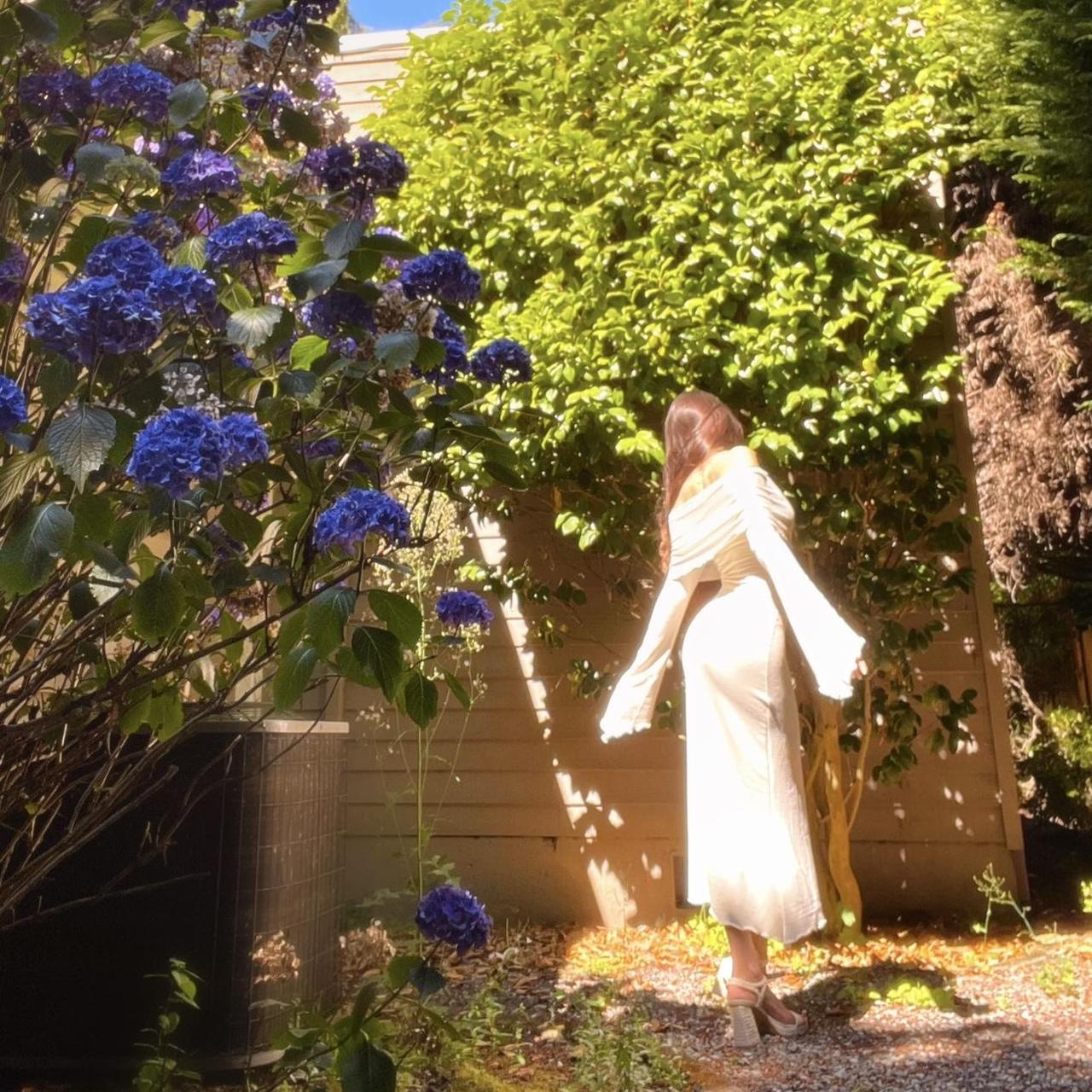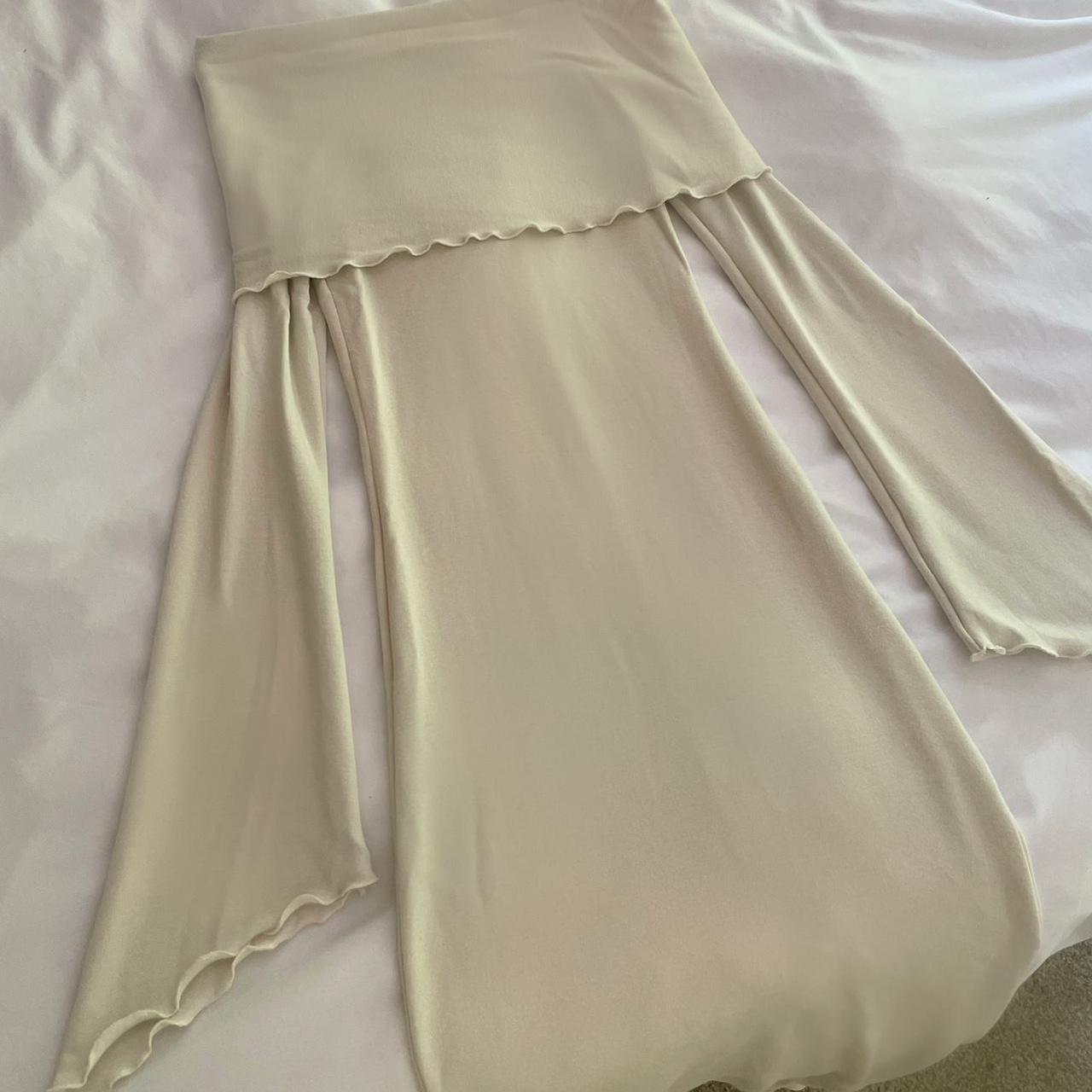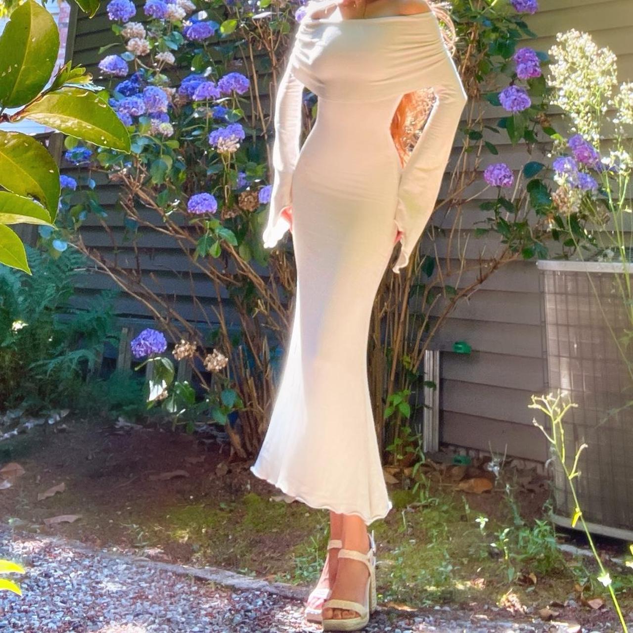 Please note that the first pics were taken under direct sun so the color appeared more white. The true color is more of an ivory/light beige. See the last pic without sun for the most accurate color representation. If youβd like this dress in a true white, message me!π€