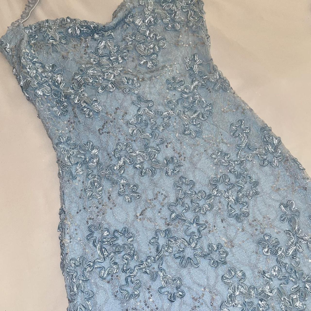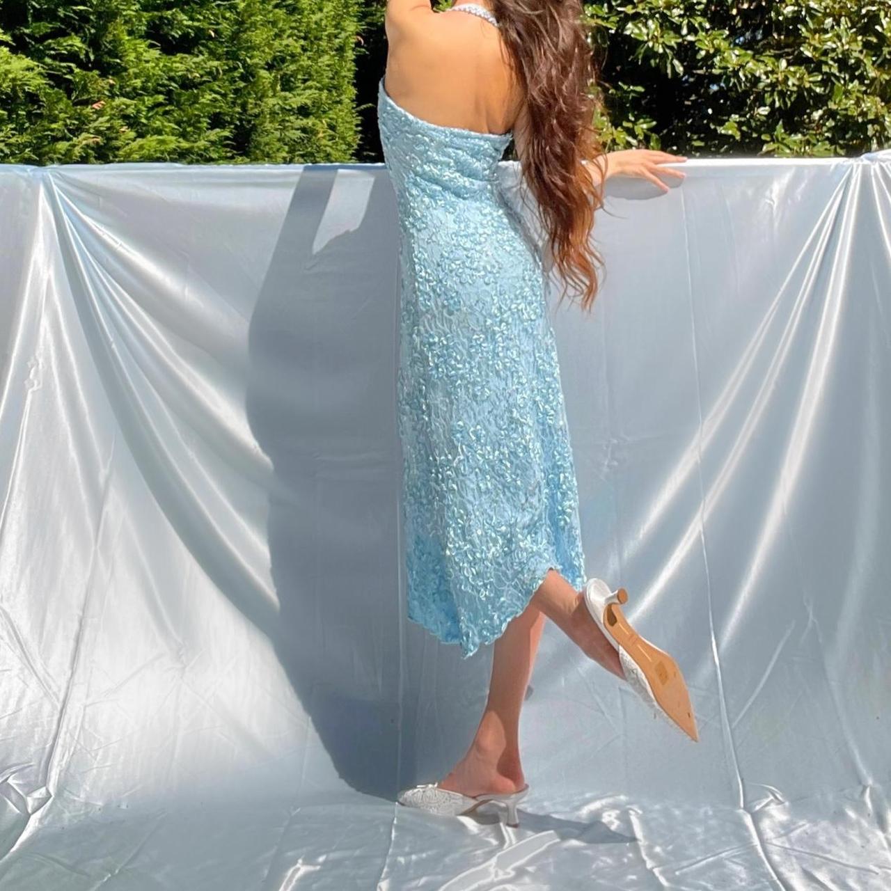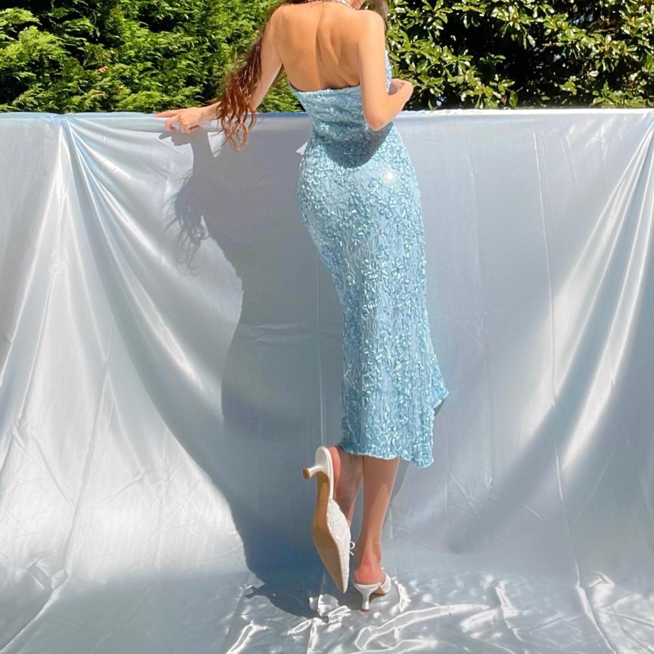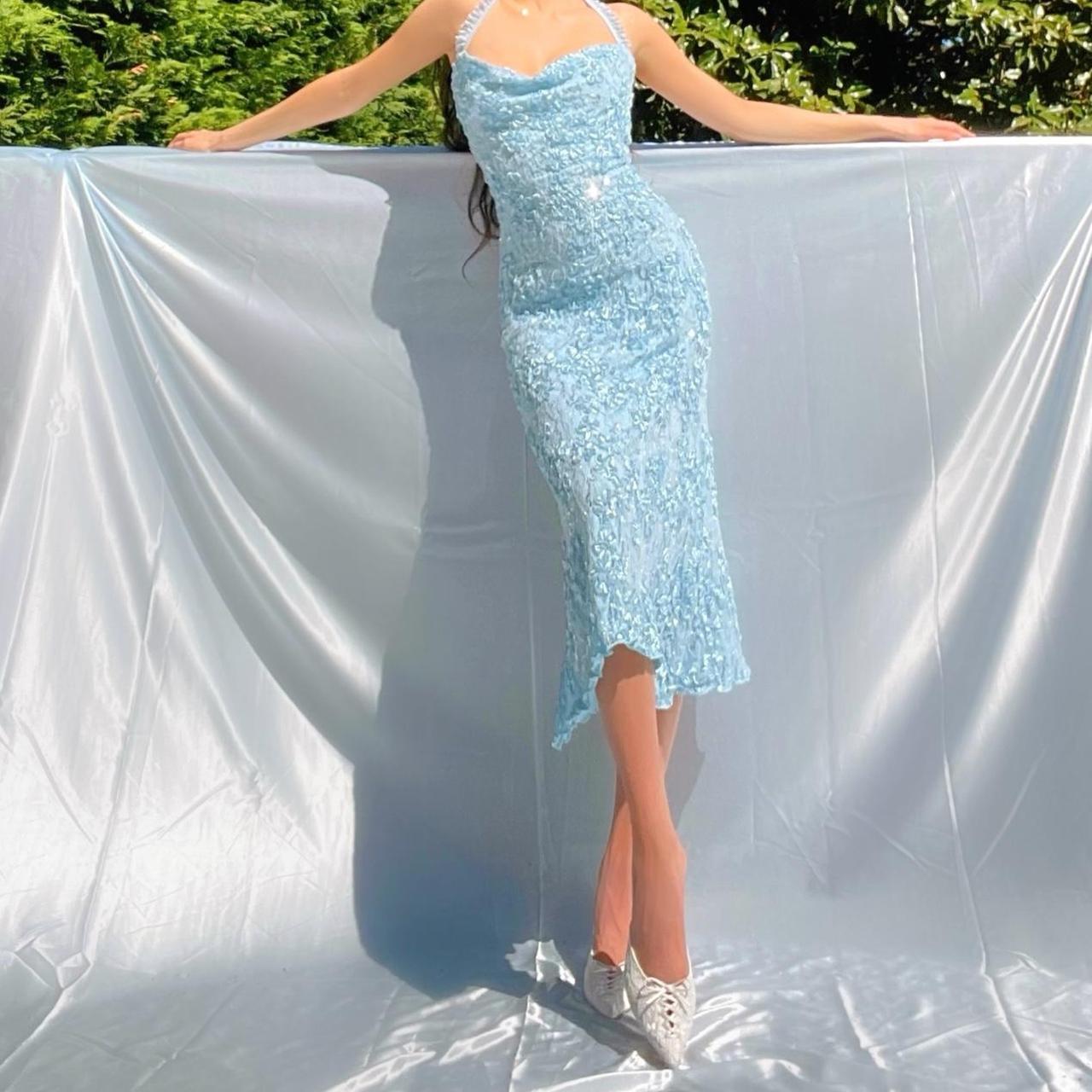 Made with a high-quality sparkly light blue embroidered lace, soft rayon lining underneath, and a ruffle halter neck strap. Slight cowl neck and a super flattering flared out mermaid hem🩵