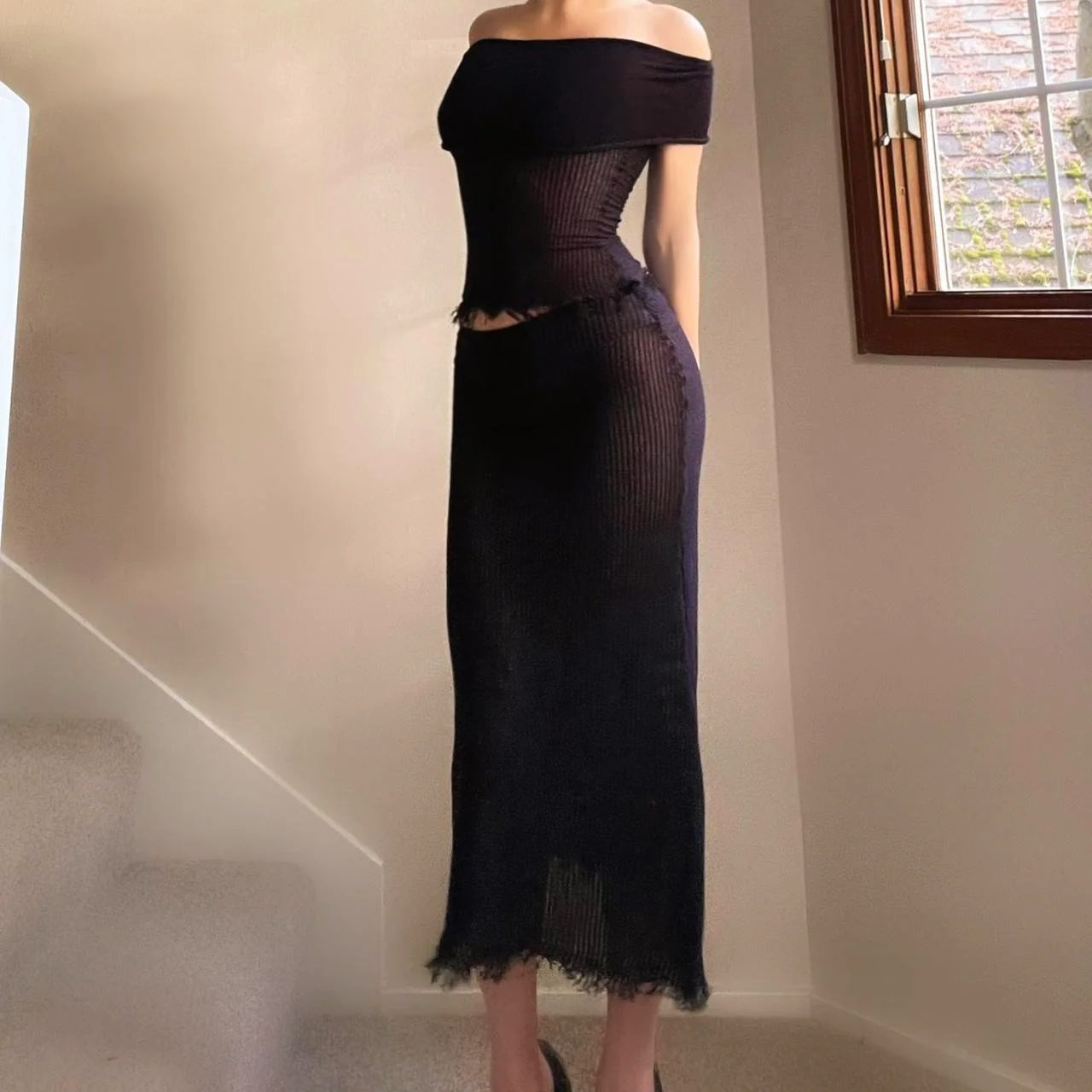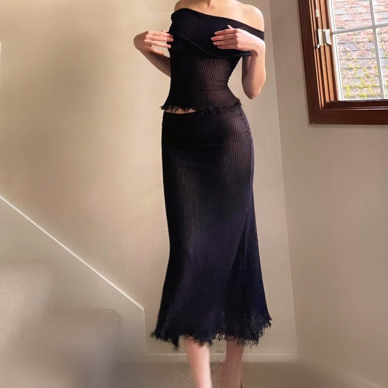 Please note that the 1/1 sample piece as seen in the pics has already been sold, and was made with a one-off, deadstock vintage fabric. I can make this exact set in a very similar designer ribbed rayon/spandex fabric, but it will be without the frayed hem. It will also be less see through! If you'd like it to be completely see through as in the pics, please mention it below and I'll find a fabric to accommodate that!