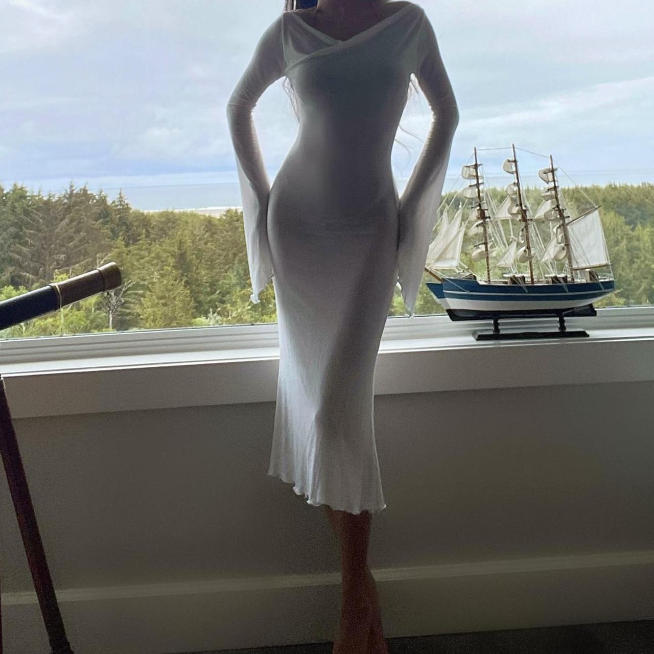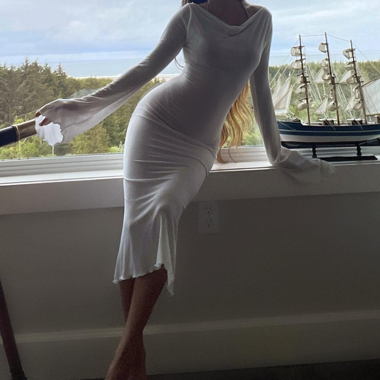 White Cowl Neck Angel Sleeve Bodycon Midi Dress (Made-to-Order)